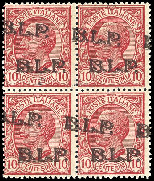 1923 - 10 cent. doppia soprastampa BLP del III tipo in bruno, di cui una obliqua (13Bda), blocco di quattro, nuovo, gomma originale ... Leggi tutto