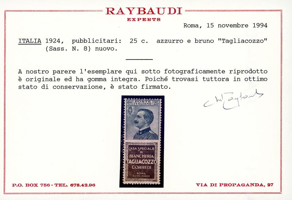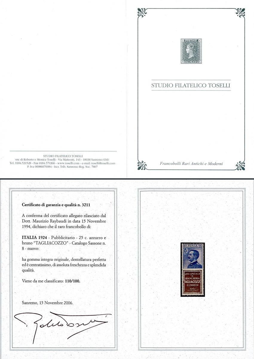 1924 - 25 cent. Tagliacozzo (8), nuovo, gomma originale integra, perfetto e molto ben centrato. Raro di questa qualità. Cert. Raybaudi e Toselli.