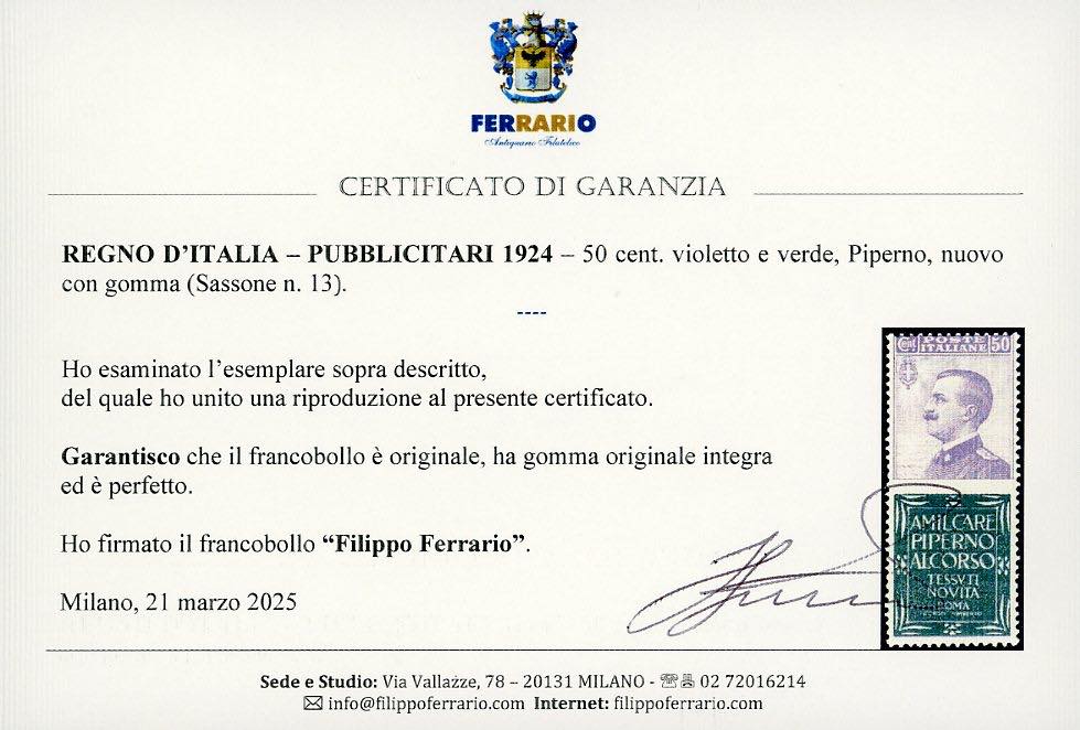 Lotto 752 - 1924 - 50 cent. Piperno (13), nuovo, gomma originale ...