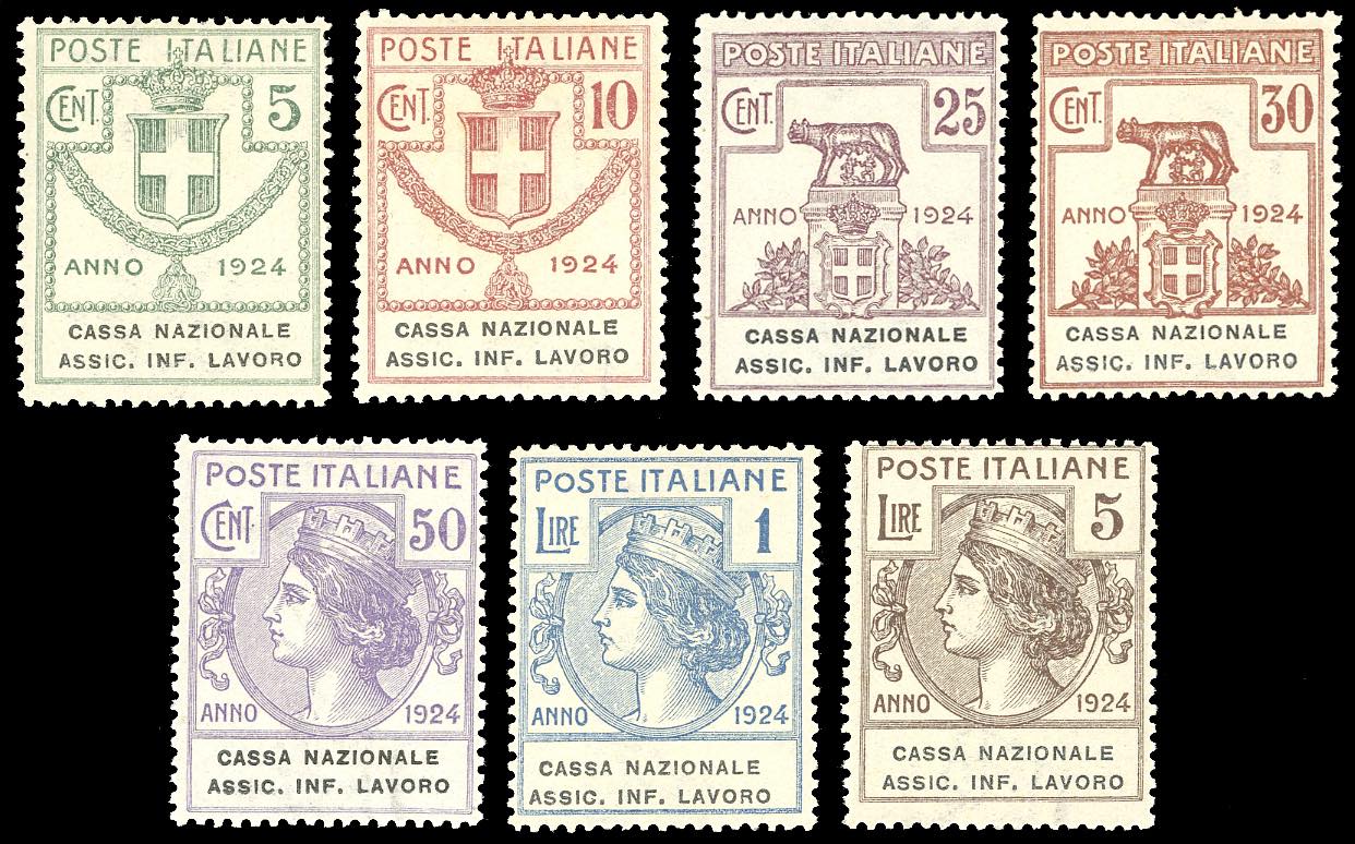 CASSA NAZIONALE ASSIC.INF.LAVORO 1924 - Serie completa (17/23), nuovi, gomma originale integra, perfetti. Molto freschi. Ferrario.