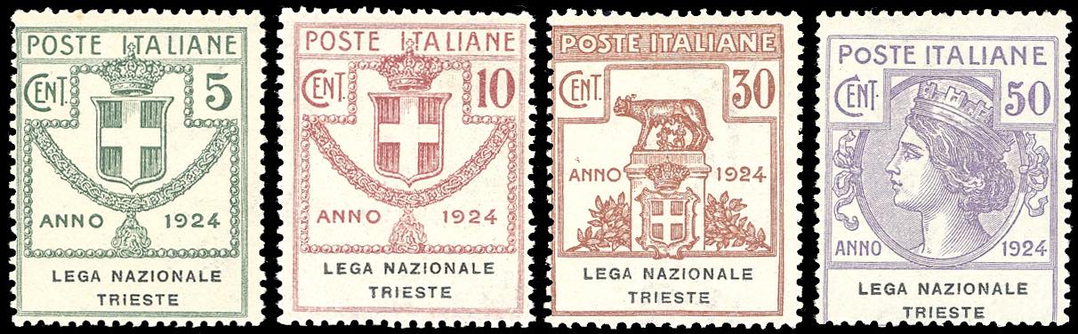 LEGA NAZIONALE TRIESTE 1924 - Serie completa (42/45), nuovi, gomma originale integra, perfetti. Cert. Raybaudi.