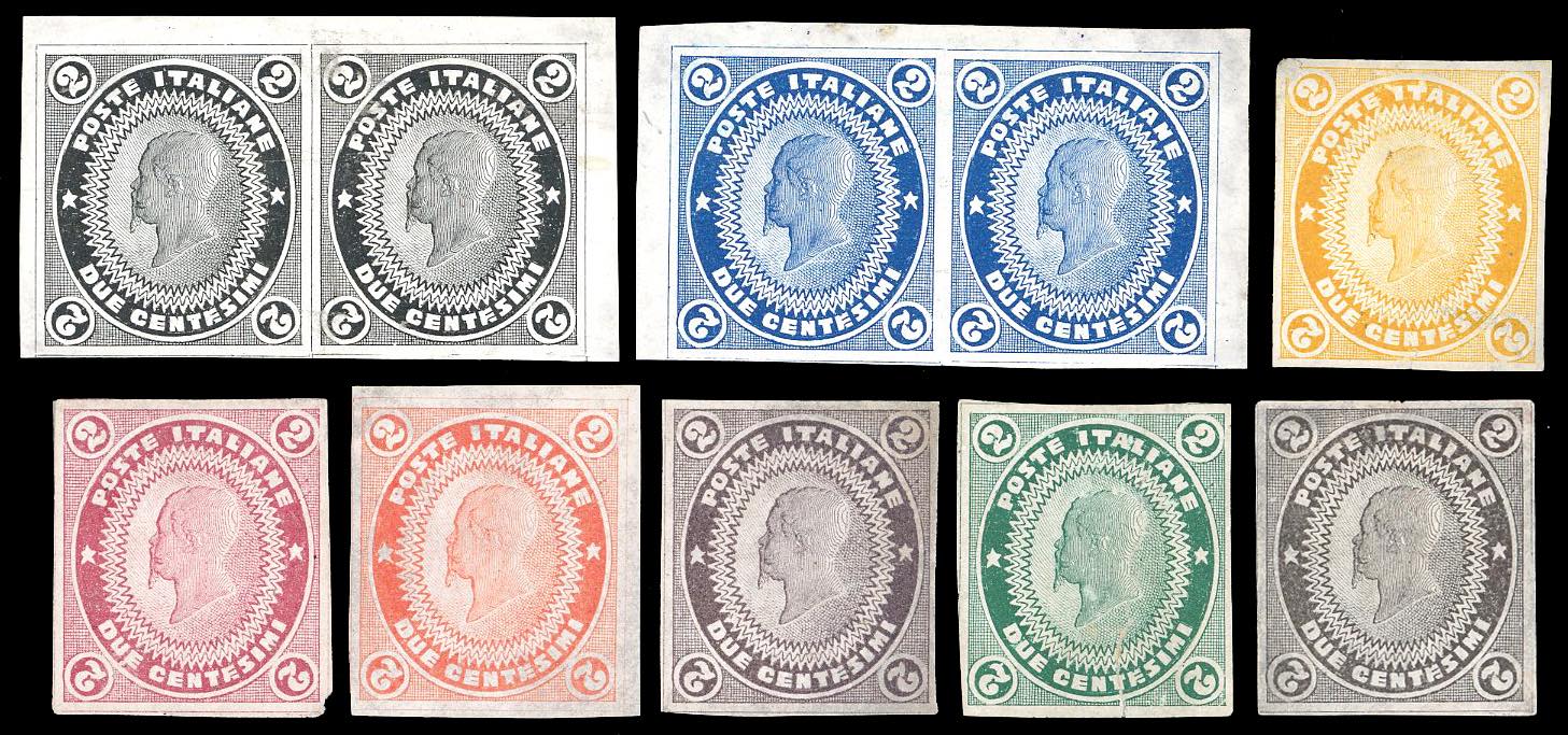 1862 - Saggi Pellas, 2 cent. (Unificato 16), due coppie e sei esemplari in colori differenti, senza gomma come sempre, perfetti ad ... Leggi tutto