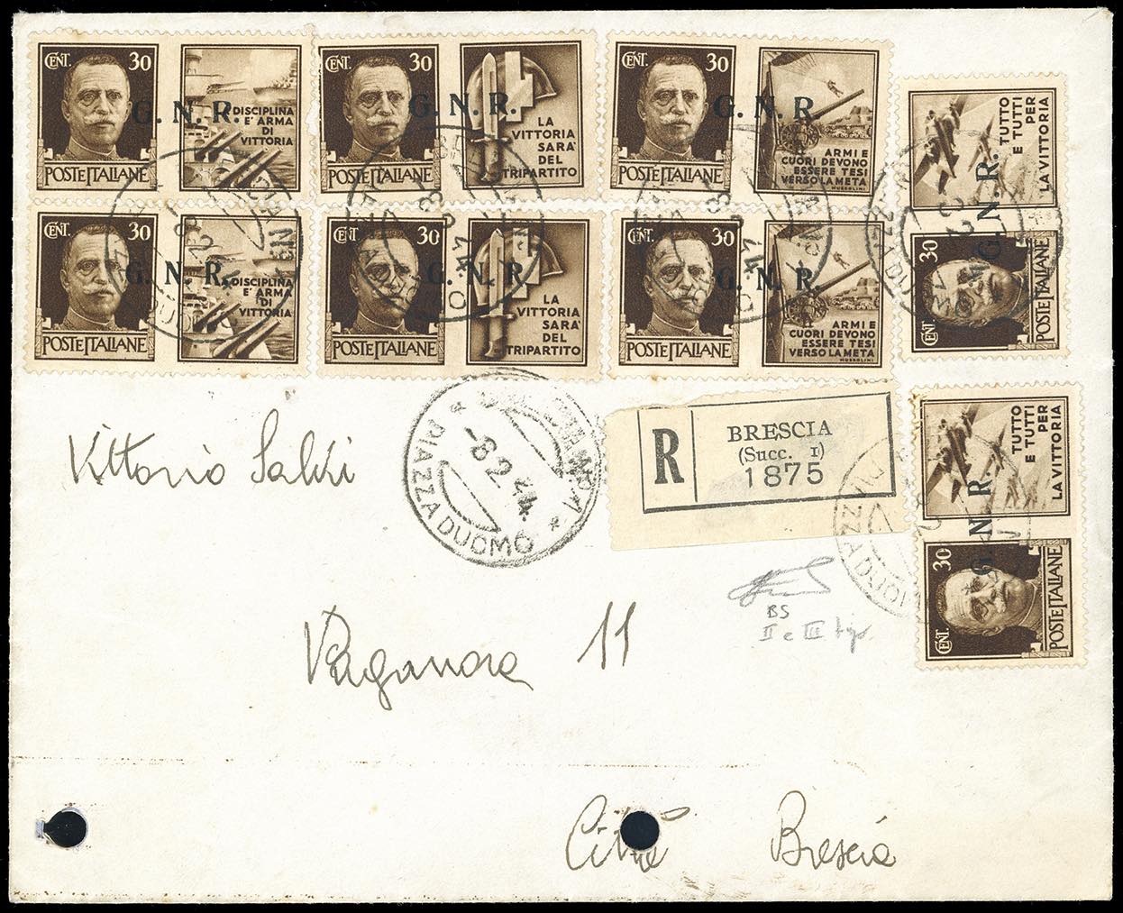 PROPAGANDA DI GUERRA 1944 - 30 cent. bruno, serie completa dei quattro valori con soprastampa G.N.R. del II tipo e del III tipo di Brescia (17/II-20/II,17/III-20/III), perfetti, su raccomandata da Brescia 8/2/1944, per città, bollo d'arrivo. Non comune. Ferrario.