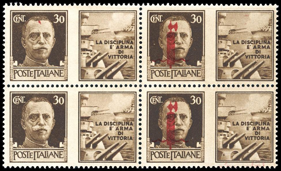 PROPAGANDA DI GUERRA 1944 - 30 cent. Marina soprastampato fascio, blocco di 4, i due esemplari di sinistra senza soprastampa (29c), gomma ... Leggi tutto