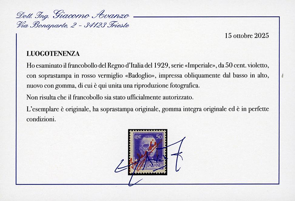1943 - 50 cent. Imperiale, soprastampa in rosso vermiglio "Badoglio" (CEI 471A, 10.500 €), nuovo, gomma originale integra, perfetto. ... Leggi tutto