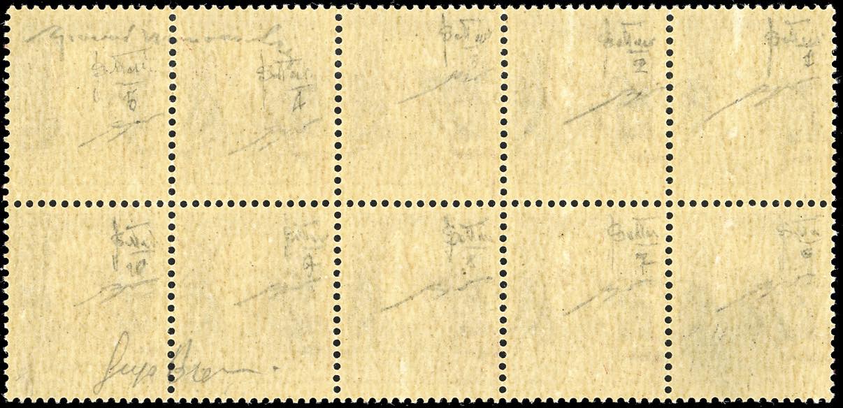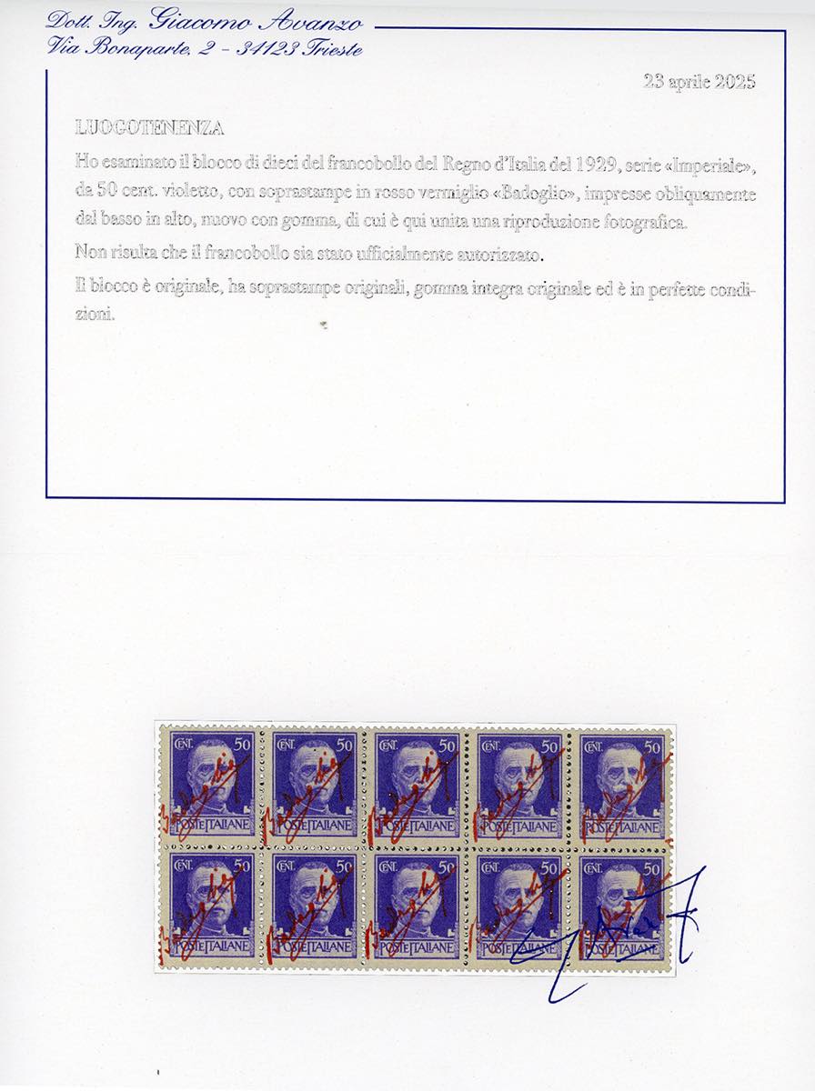 1943 - 50 cent. Imperiale, soprastampa in rosso vermiglio "Badoglio" (CEI 471A, 105.000+), foglietto di 10 esemplari, nuovo, gomma originale integra, perfetto. Rarissimo, pochissimi esistenti. Chiavarello, cert. Avanzo.