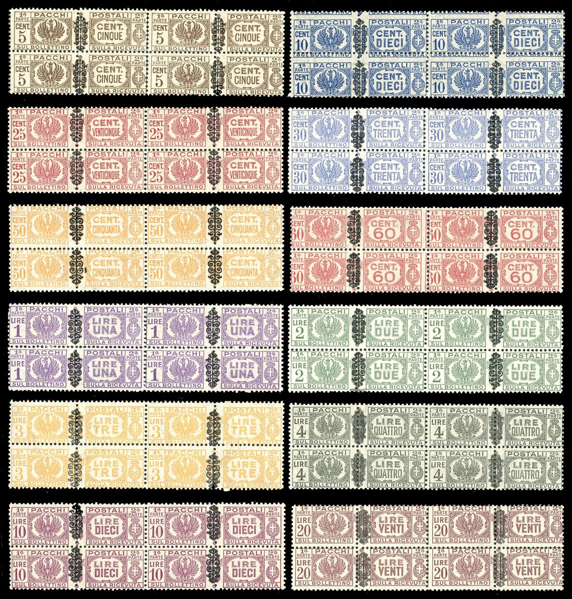 PACCHI POSTALI 1945 - Soprastampati, serie completa (48/59), blocchi di quattro, nuovi, gomma originale integra, perfetti. Alti valori ... Leggi tutto