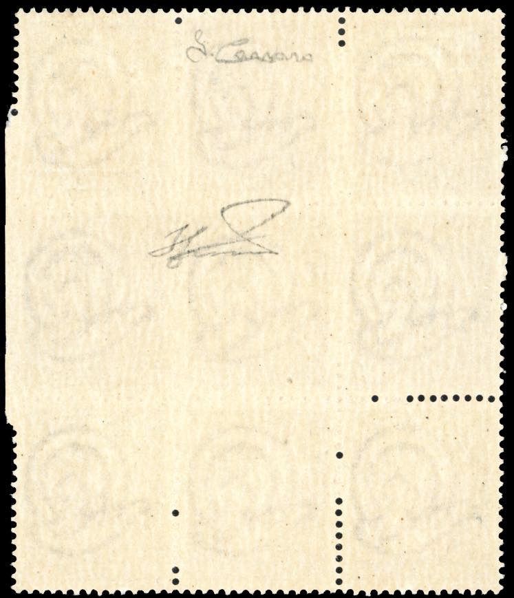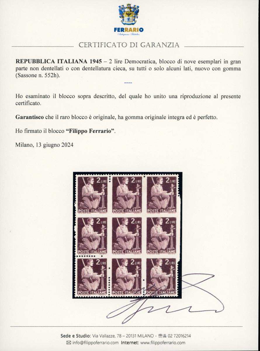 1945 - 2 lire Democratica, blocco di nove esemplari in gran parte non dentellati o con dentellatura cieca, su tutti o solo alcuni lati (552h), gomma originale integra, perfetto e di ottima qualità. Insieme rarissimo. Carraro, cert. Ferrario.