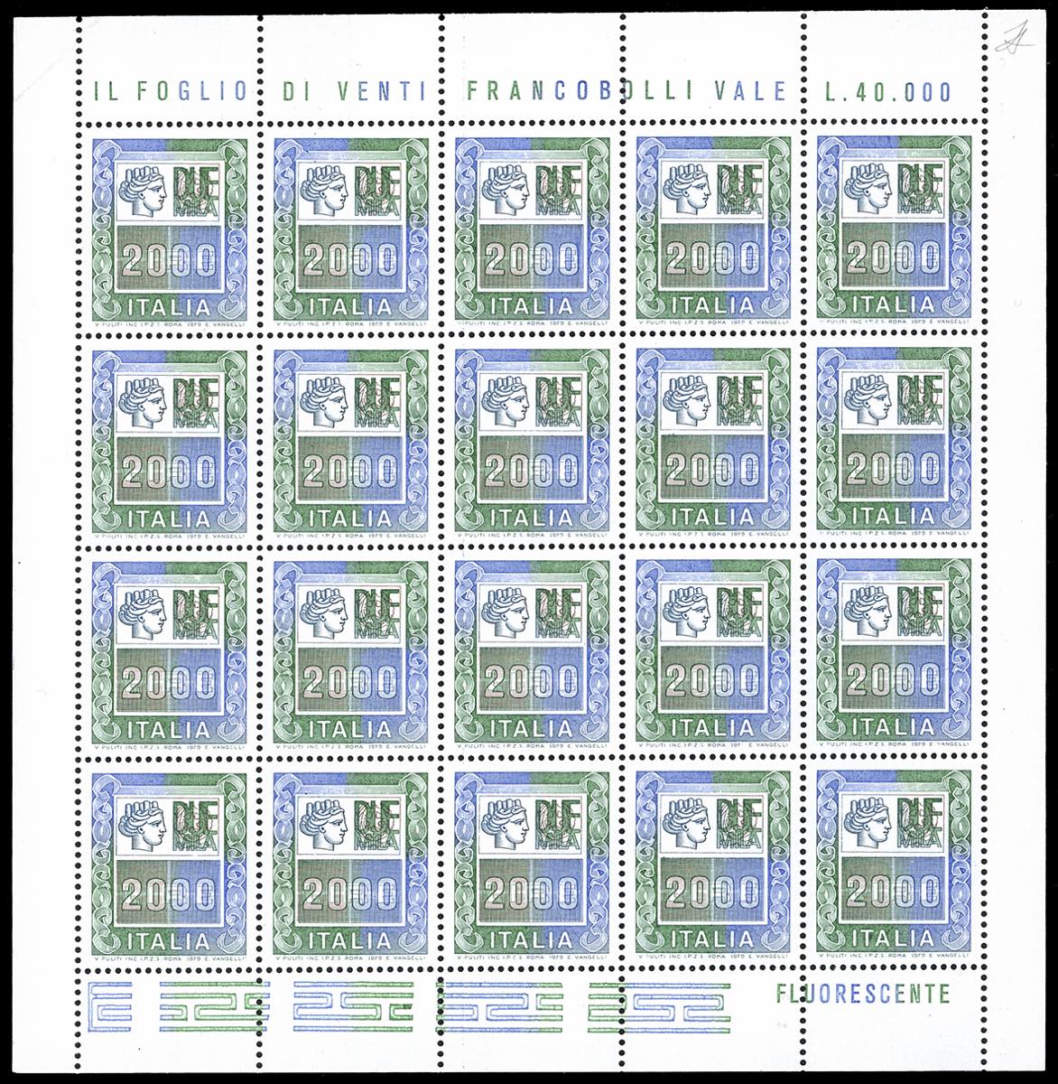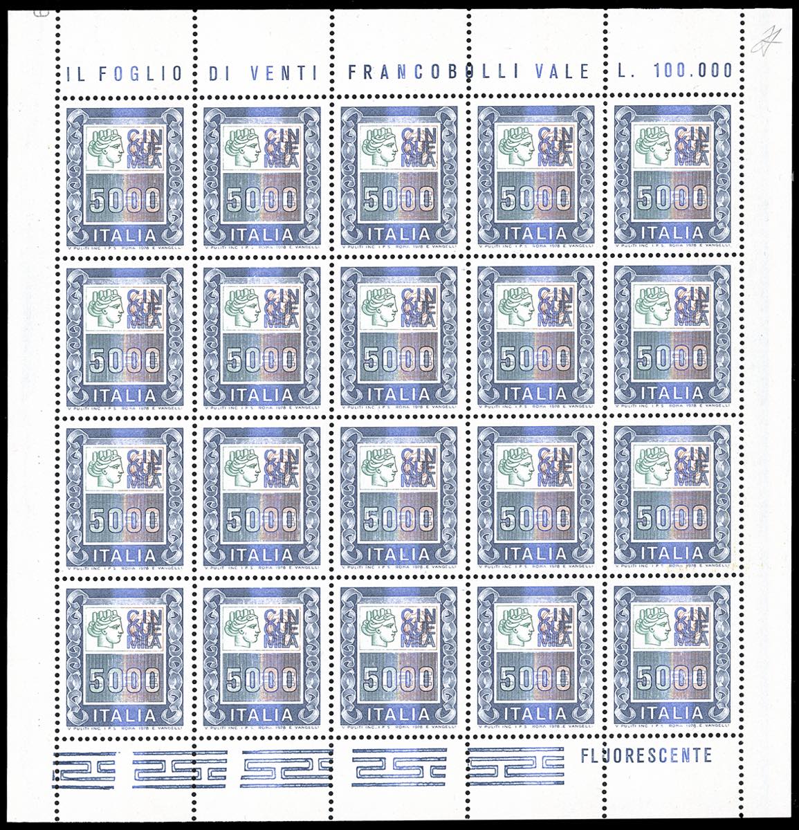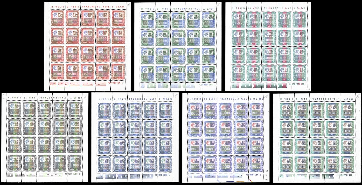 1978/87 - Alti valori, minifogli, serie completa dal 1.500 al 20.000 lire (1438/1442B), nuovi, gomma originale integra, perfetti. Ottima qualità. Ferrario.