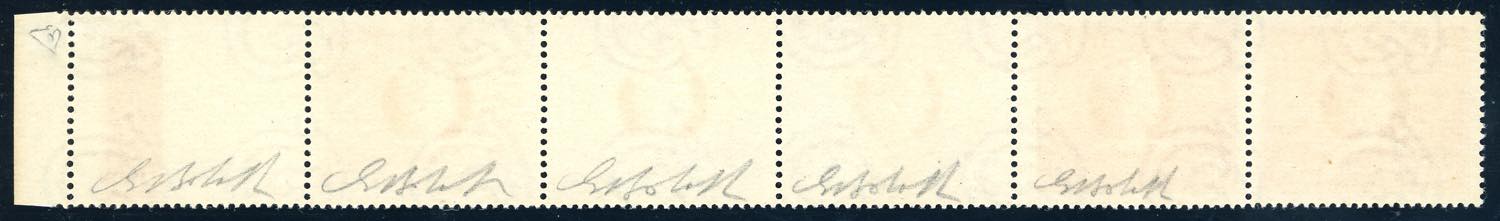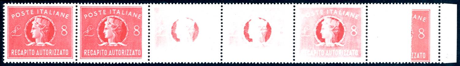 1947 - 8 lire, striscia orizzontale di sei, cinque esemplari con stampa incompleta o evanescente (9a), bordo di foglio, gomma originale ... Leggi tutto