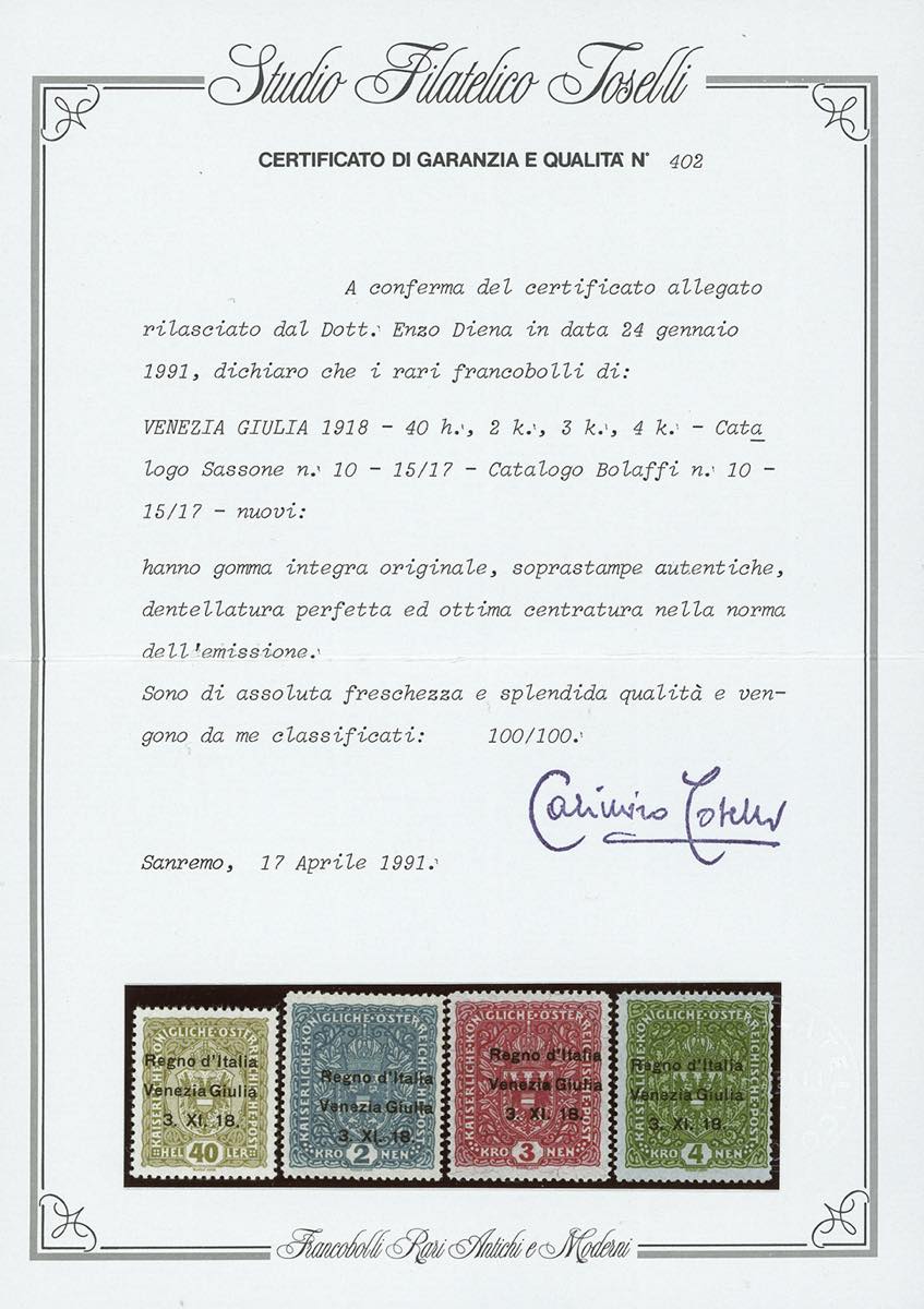 VENEZIA GIULIA 1918 - Soprastampati, serie completa (1/17), nuovi, gomma originale integra, perfetti e di ottima qualità. Splendidi. Alti valori cert. E.Diena e Toselli 100%.