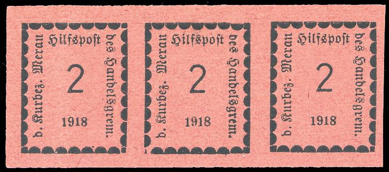 Lotto 911 - MERANO 1918 - 2 h. rosa (1), striscia orizzontale di tre, ...