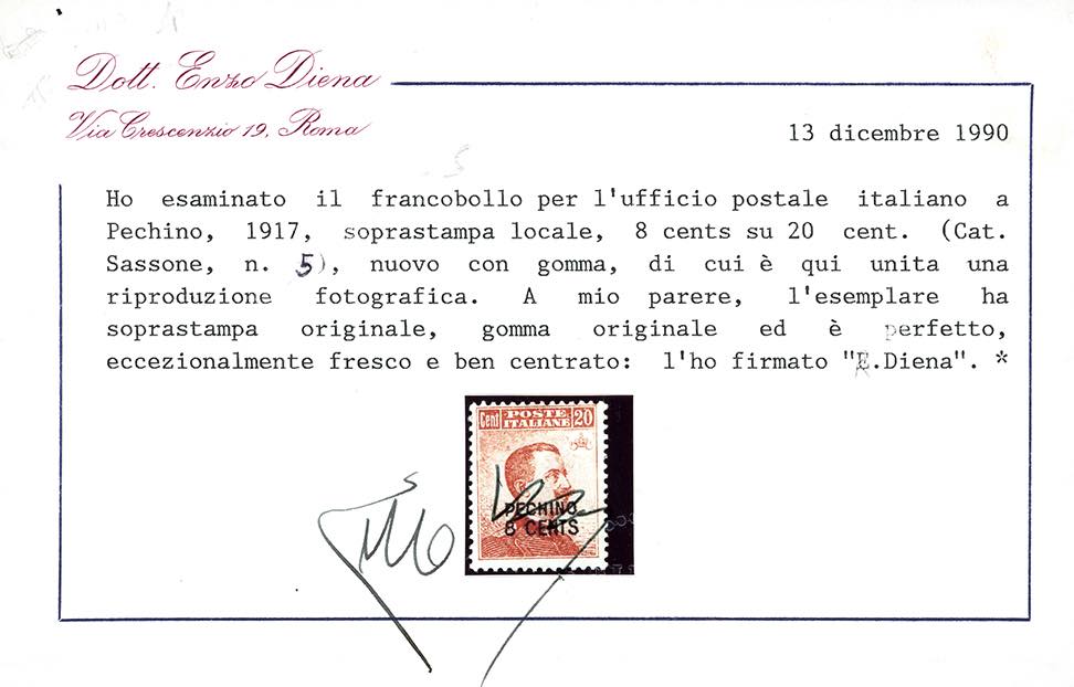 PECHINO 1917 - 8 cent. su 20 cent. Michetti, soprastampa locale a mano (5), nuovo, gomma originale, perfetto. Cert. E.Diena.