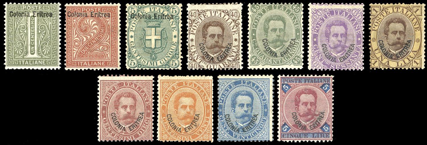 1893 - Prima emissione, soprastampati Colonia Eritrea (1/11), nuovi, gomma originale, leggere linguella, perfetti. Alti valori firmati Ferrario.