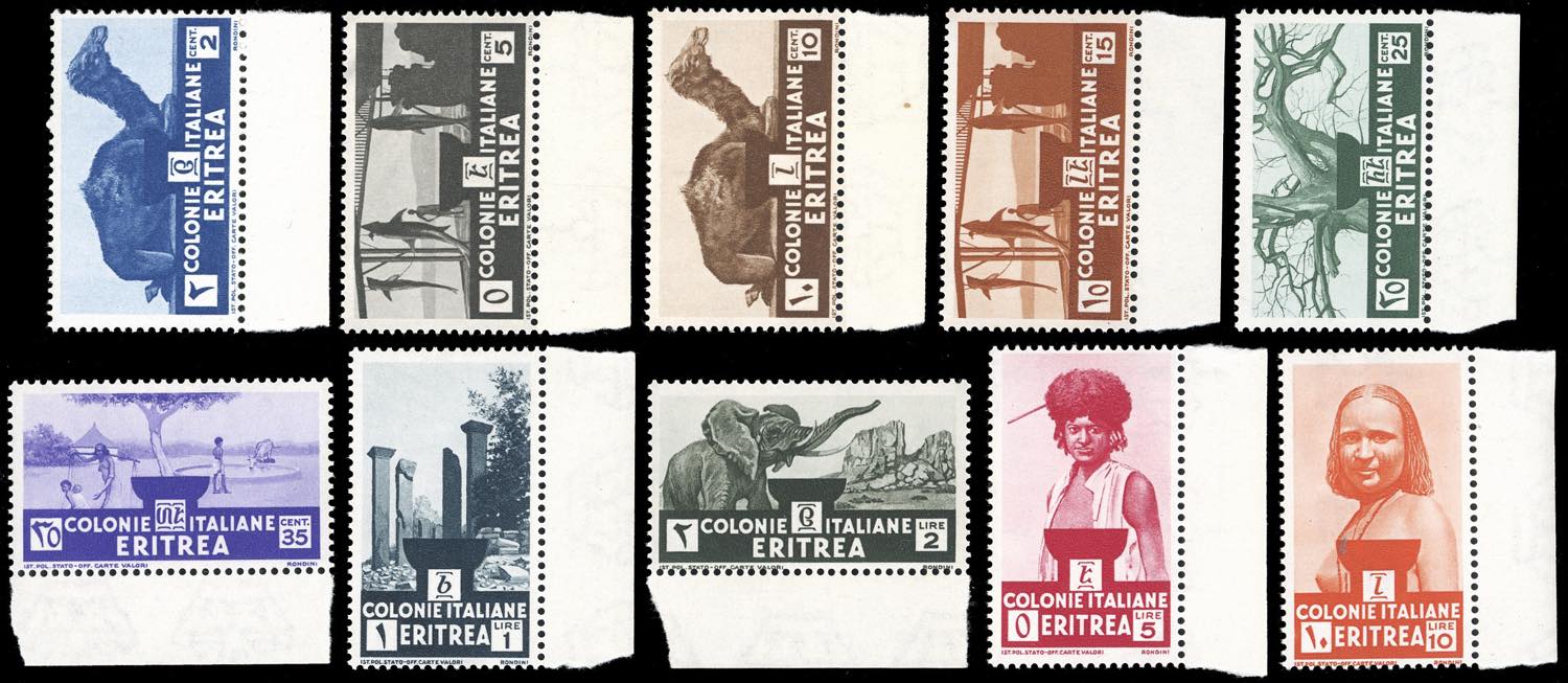 1933 - Soggetti africani, serie completa (203/212), nuovi, tutti bordo di foglio, gomma originale integra, perfetti. Molto belli.