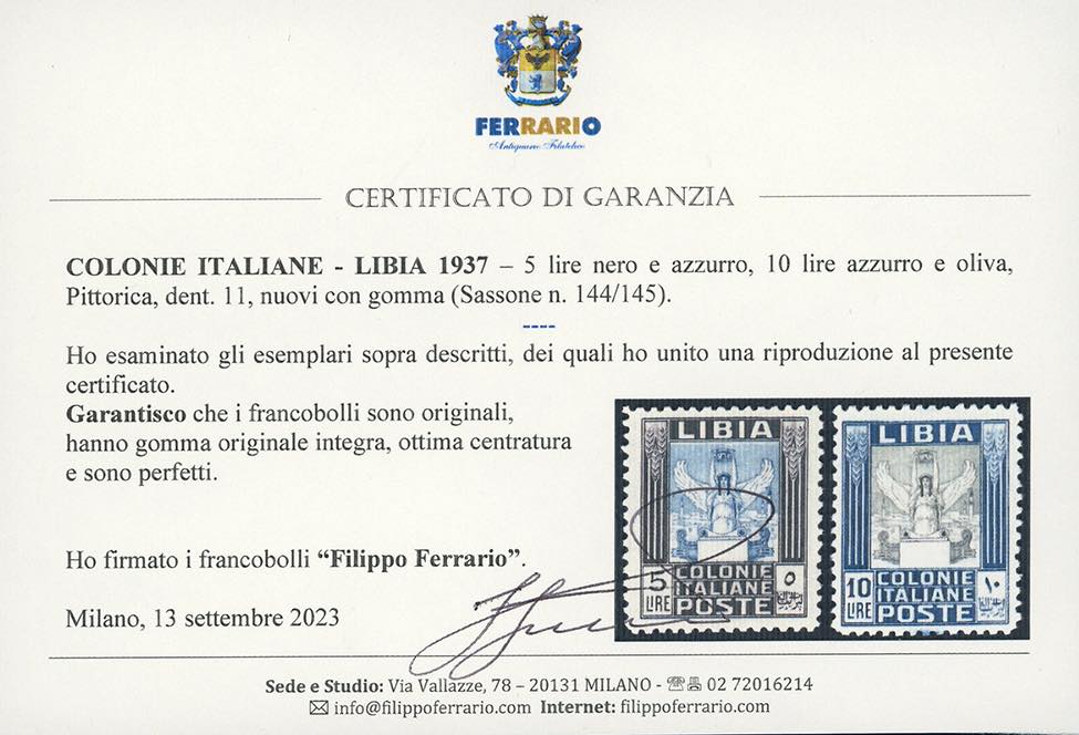 1937 - 5 lire e 10 lire Pittorica, senza filigrana, dent. 11 (144/145), ottima centratura, gomma originale integra, perfetti. Splendidi e rari di questa qualità. A.Diena, cert. Oro Raybaudi e Ferrario.