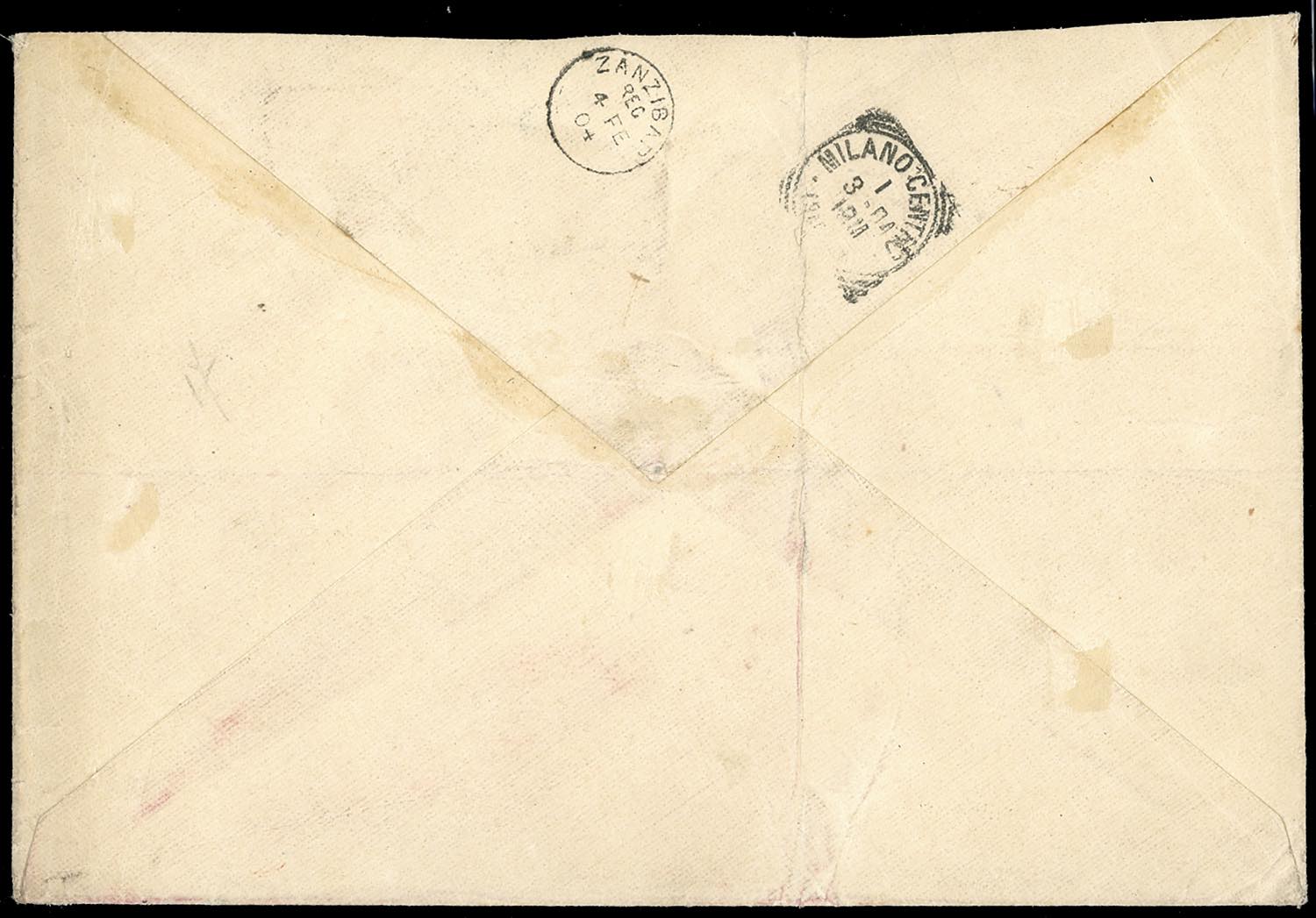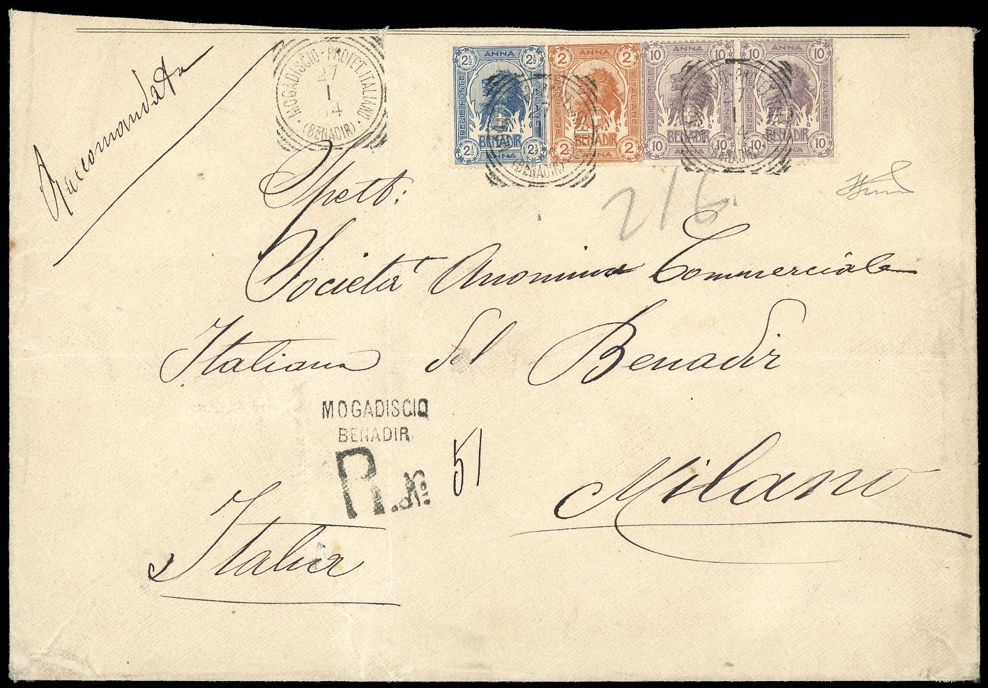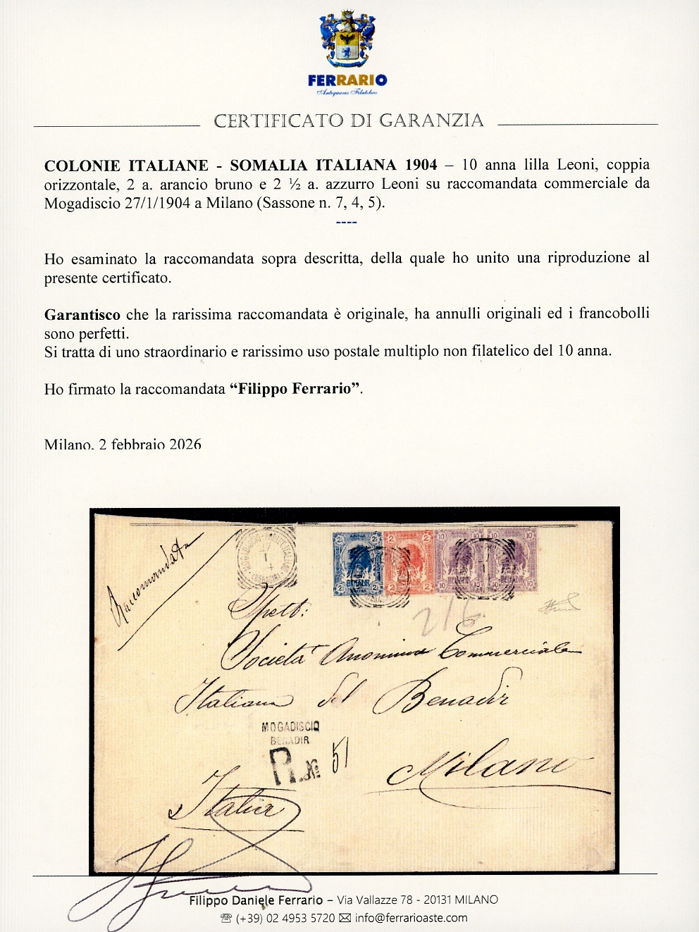 1904 - 10 anna lilla Leoni, coppia orizzontale, 2 e 2 1/2 a. Leoni (7,4,5), perfetti su raccomandata commerciale da Mogadiscio 27/1/1904 a Milano. Straordinario e rarissimo uso postale multiplo non filatelico del 10 anna. Rarità del settore, finora inedita. Cert. Ferrario.