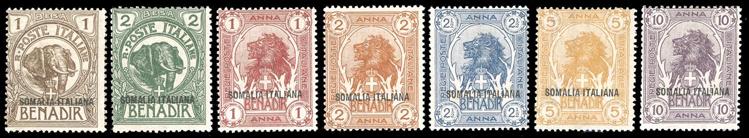 1921 - Elefanti e Leoni, non emessi, soprastampati, serie completa (23A/23G), nuovi, gomma originale integra, perfetti. Bellissimi e molto rari. Firmati Enzo e Alberto Diena, cert. Ferrario e Bolaffi finanziario 100%.