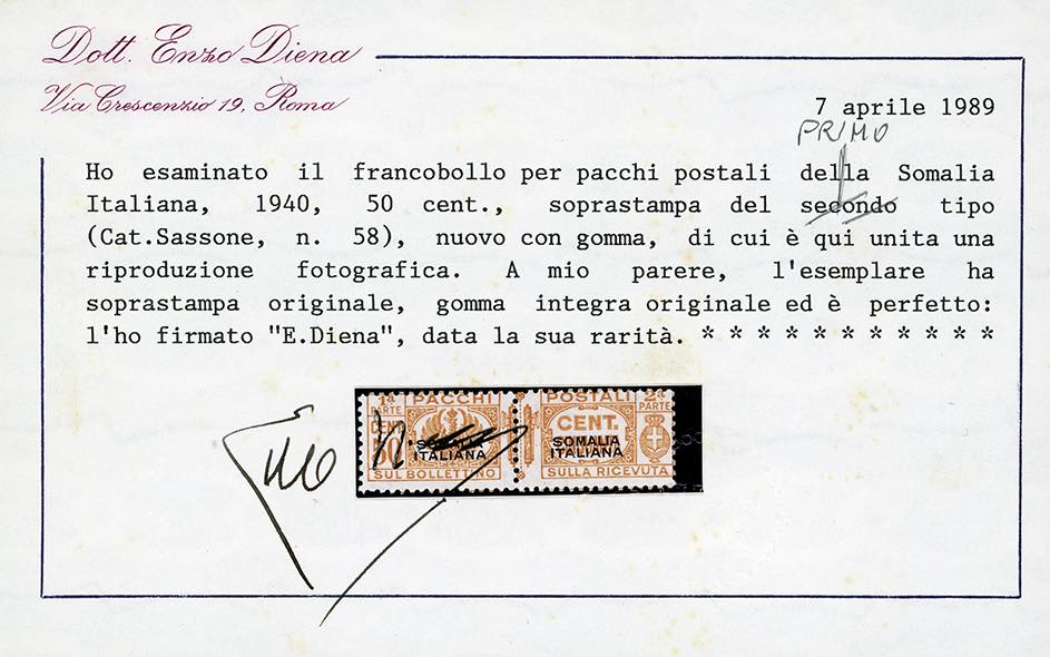 PACCHI POSTALI 1940 - 50 cent. arancio fasci al centro, soprastampa del I tipo (58), nuovo, gomma originale integra, perfetto. Molto raro e di ottima qualità. A.Diena, cert. E.Diena.