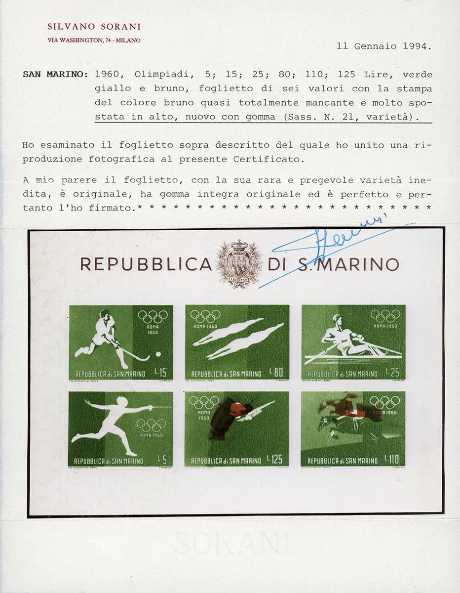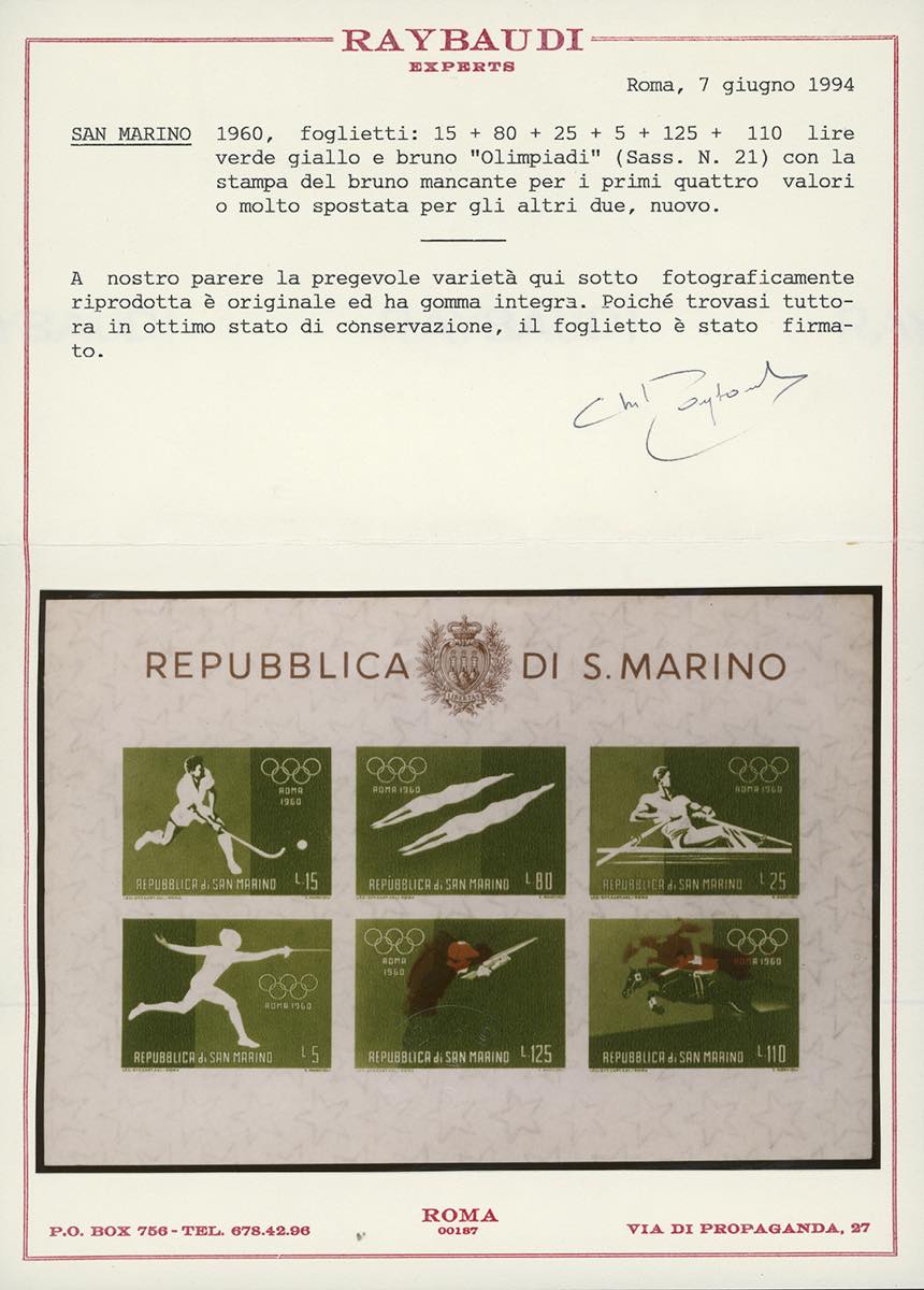 1960 - Foglietto verde e bruno, Olimpiadi di Roma, stampa del bruno mancante nei tre esemplari superiori e nel primo inferiore, e bruno ... Leggi tutto
