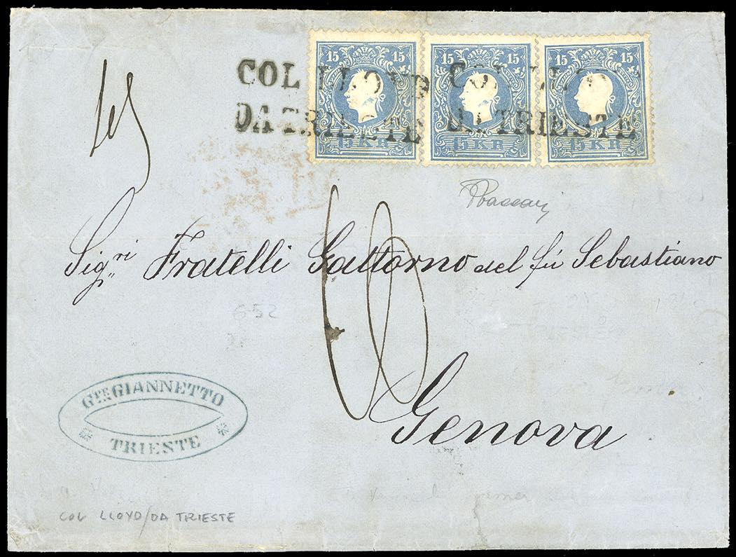 AUSTRIA 1860 - Lettera da Trieste per Genova del 16 ottobre 1860 recante affrancatura triplo porto con tre esemplari del 15 kr. (16) annullati dal bollo “Col. Lloyd da Trieste” apposto a Venezia in transito. In arrivo a Genova fu tassata per una lira per lettere da 35 a 50 gr. Molto bella, rara tariffa. Sigla Vaccari.