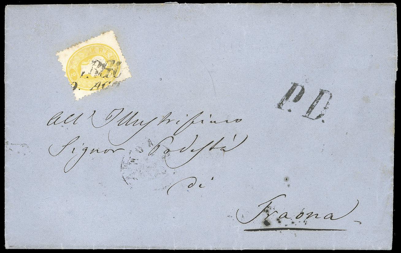 AUSTRIA 1862 - 2 kr. giallo (Austria 17), perfetto, isolato su circolare a stampa da Arco 9/8/1862 a Traona.