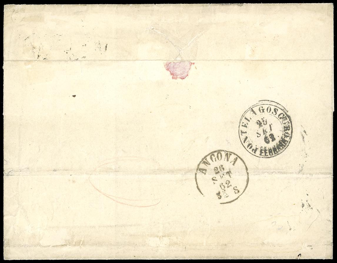 AUSTRIA 1862 - Lettera da Vienna per Ancona del 27 settembre 1862 affrancata per 52 kreuzer della IV emissione d’Austria con quattro esemplari del 3 kr., due del 5 kr. e due del 10 kr. (18,19,20), in tariffa doppio porto da 26 kreuzer per distanze dalla III sezione austriaca alla II italiana. Spettacolare affrancatura, in eccellente stato, scambiata a Pontelagoscuro. Molto rara.