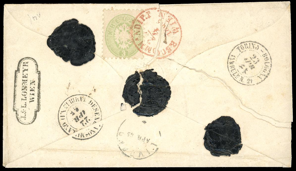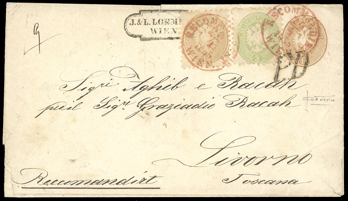 AUSTRIA 1865 - Intero postale da 15 kreuzer spedito per raccomandata da Vienna per Livorno del 20 aprile 1865 con integrazione di due es. del 3 kr. (uno al verso) e uno del 15 kr. dell’emissione 1863 (28,31), annullati col bollo in rosso “Raccomandirt Wien 20/4- 1865”. Tariffa dalla III sez. austriaca alla II italiana di tre porti (26 kreuzer + 10 kreuzer per diritto di raccomandazione). Pregevole affrancatura.