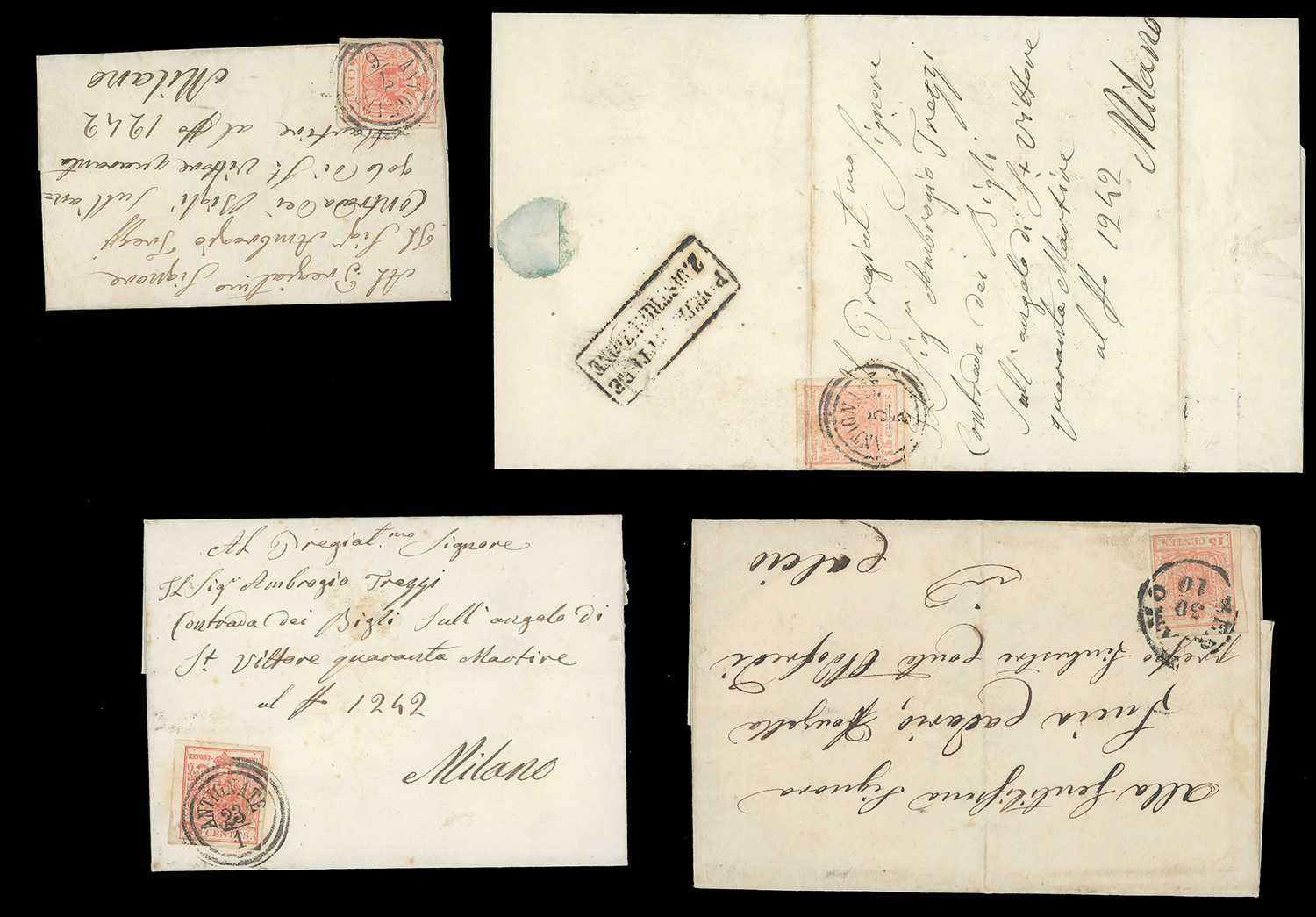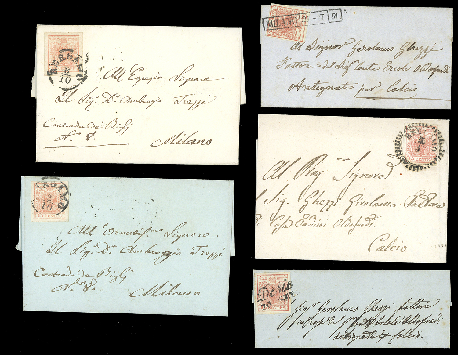 LOMBARDO VENETO 1850/1858 - Nove lettere affrancate con 15 cent. della I emissione, con discreta varietà di annulli, generalmente di buona qualità.