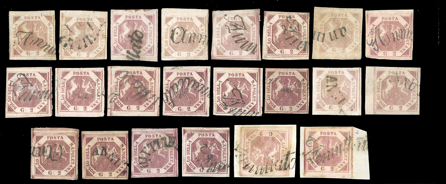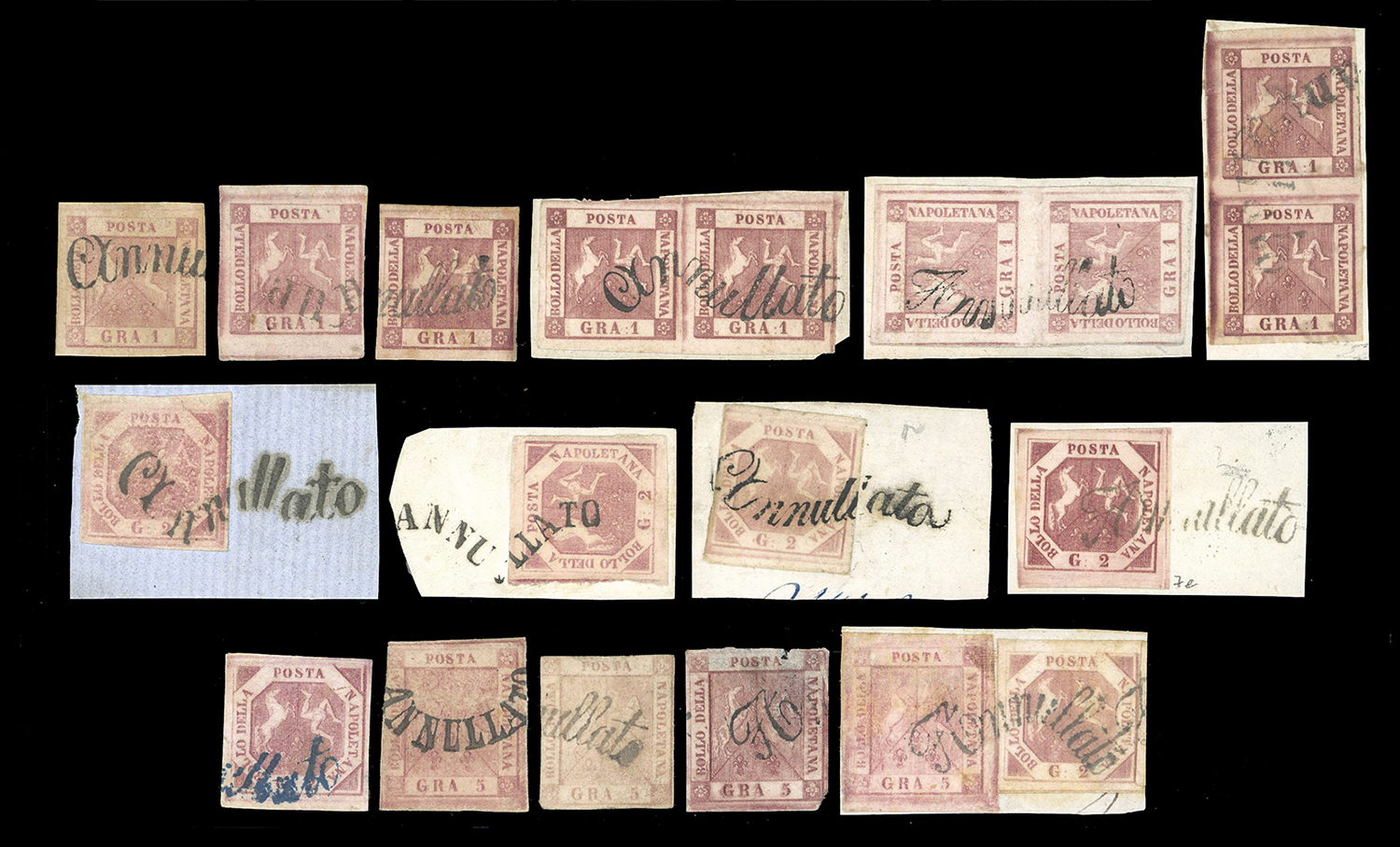 NAPOLI 1858/1860 - Bell'insieme di 41 francobolli e tre lettere con annulli a svolazzo. Moltissimi esemplari firmati e di ottima qualità. Insieme non comune. Ex collezione Imperato.