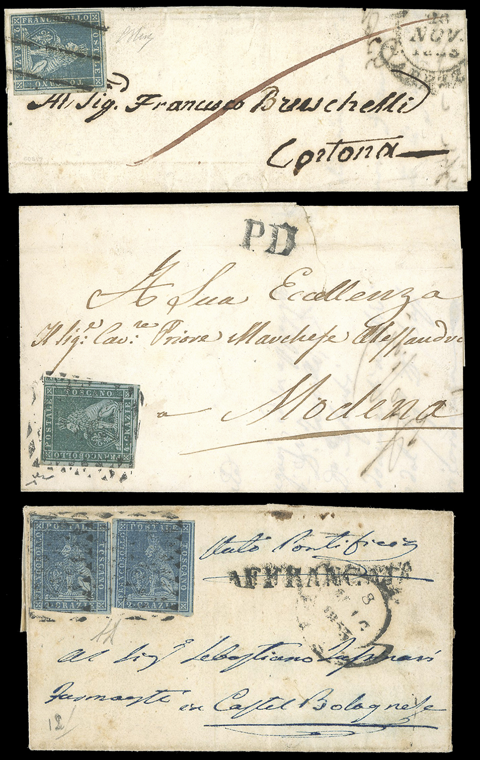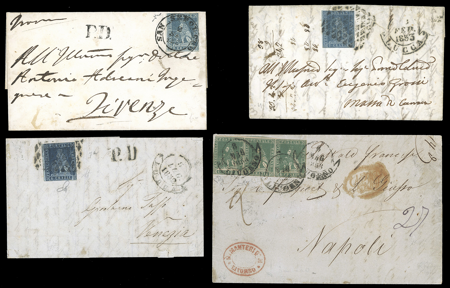TOSCANA 1852/1858 - Bell'insieme di 8 lettere ed un grande frammento, con affrancature e annulli del periodo. Diverse firmate da noti periti. Ottimo per dettaglio. Ex coll. Imperato.