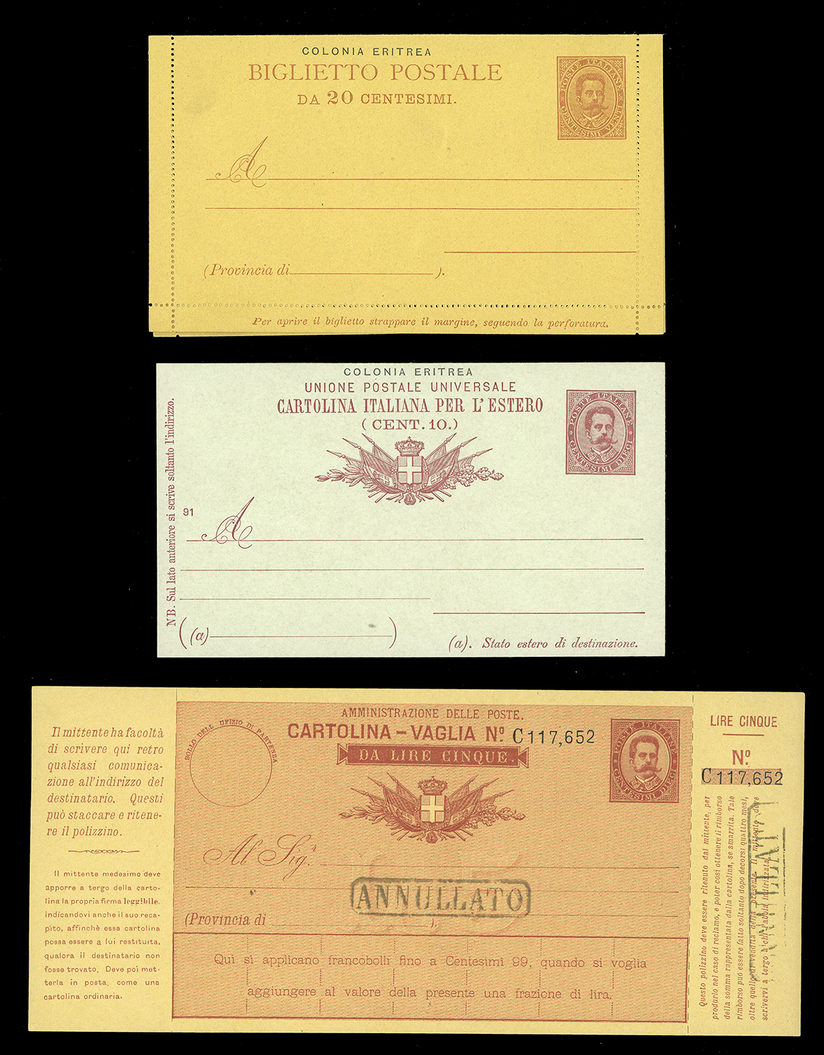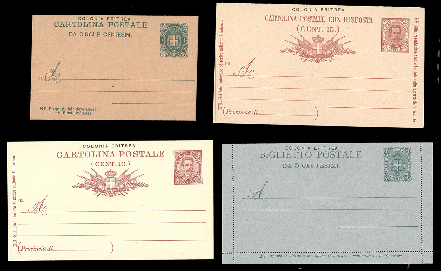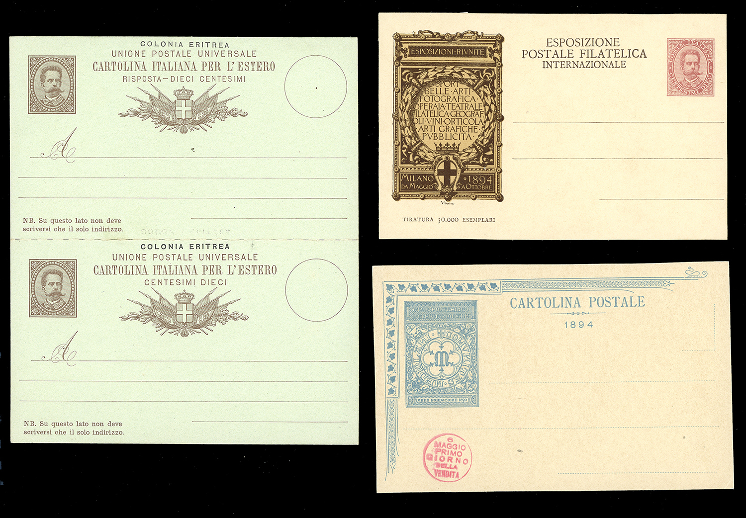 REGNO D'ITALIA INTERI POSTALI 1890/1900 - Interessante insieme di cartoline postali, cartoline vaglia e cartoline di commissione privata del periodo nuove, con alcune presenze della Colonia Eritrea, ottima qualità.
