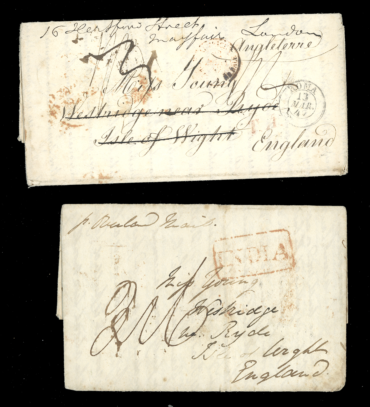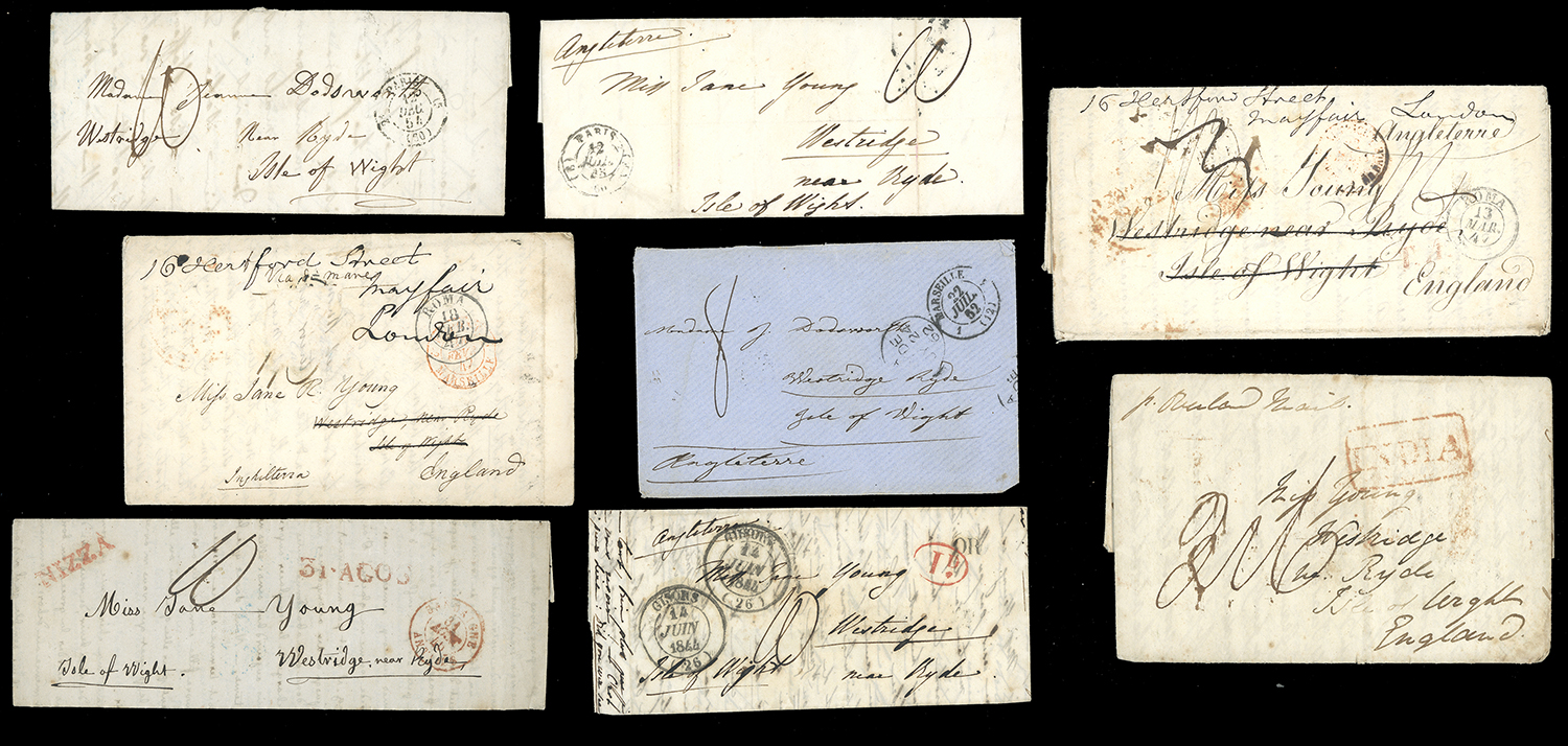 GRAN BRETAGNA 1843/1854 - Piccolo ma interessante insieme di otto lettere prefilateliche o non affrancate, tutte dirette all'Isola di Wight. Notate due dallo Stato Pontificio e una dall'India. Interessante e non comune insieme.