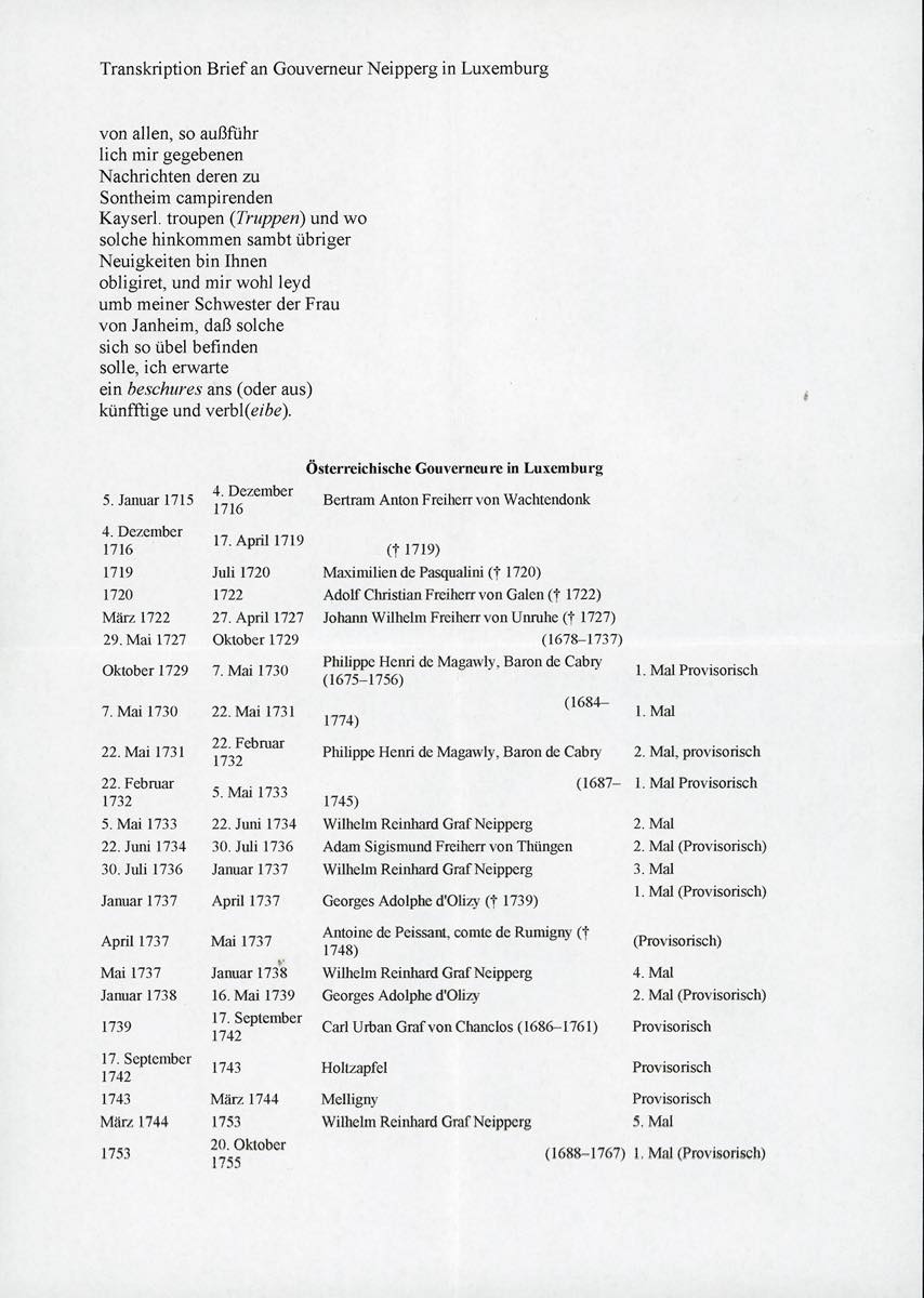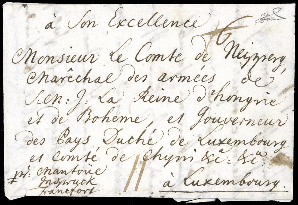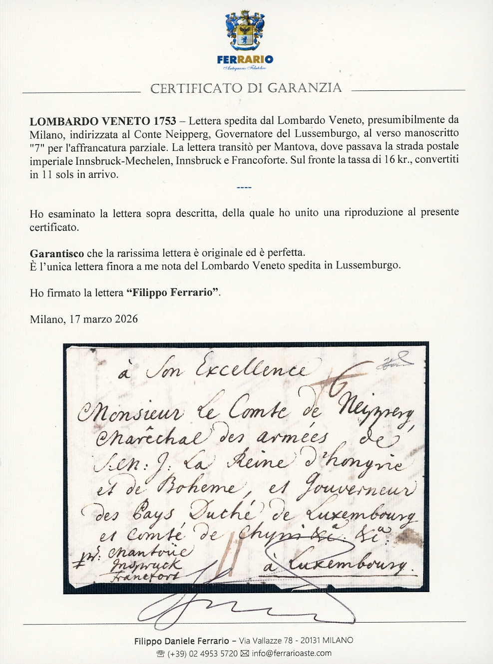 1753 - Lettera spedita dal Lombardo Veneto, presumibilmente da Milano, indirizzata al Conte Neipperg, Governatore del Lussemburgo, al verso manoscritto "7" per l'affrancatura parziale. La lettera transitò per Mantova, dove passava la strada postale imperiale Innsbruck-Mechelen, Innsbruck e Francoforte. Sul fronte la tassa di 16 kr., convertiti in 11 sols in arrivo. Destinazione molto rara. Allegato regesto (in tedesco). Cert. Ferrario.
