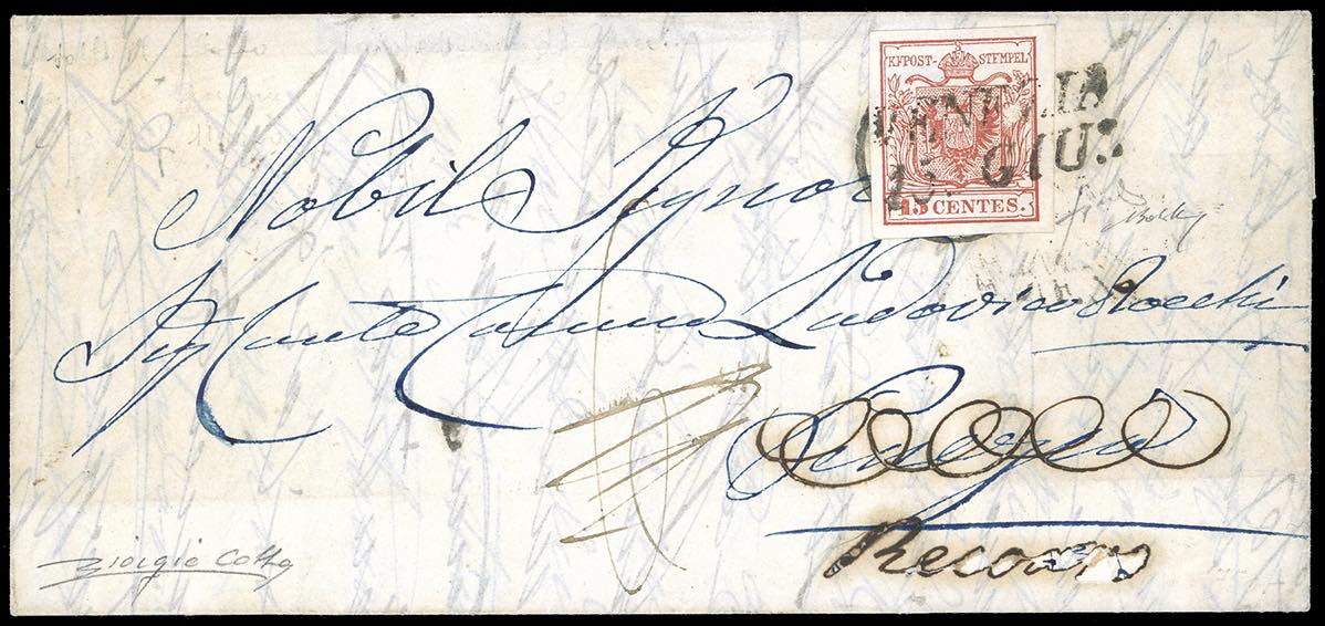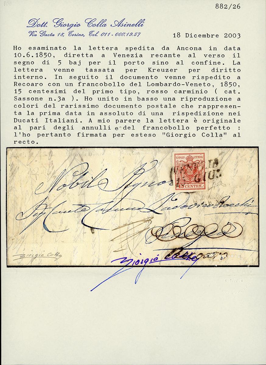 1850 - Lettera da Ancona 10/6/1850 a Venezia, al verso indicati i 5 baj pagati per il diritto di impostazione sino al confine e sul fronte la tassa di 6 carantani pagati e successivamente cassati in arrivo. A Venezia la lettera venne rispedita il 15/6/1850 previa affrancatura con 15 cent. rosso carminio, I tiratura (3a), perfetto, per Recoaro. Si tratta della PRIMA DATA ASSOLUTA NOTA di una rispedizione con un francobollo degli Antichi Stati Italiani. Importante rarità per specialista, di ottima qualità. A.Bolaffi, Fiecchi, cert. Colla (con firma per esteso).