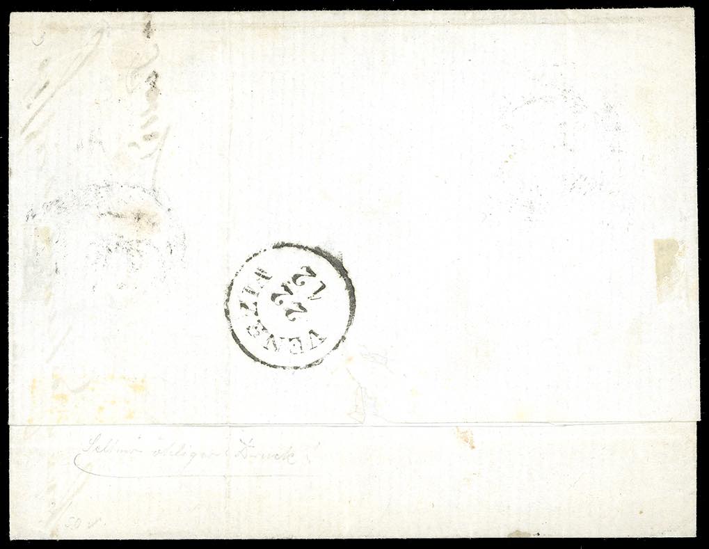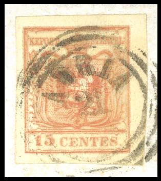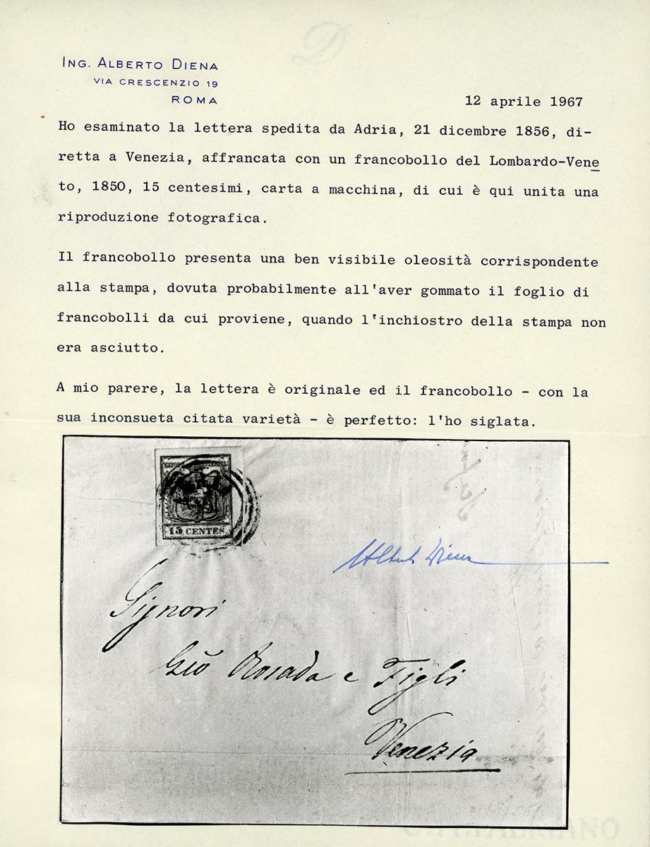 1856 - 15 cent. rosso vermiglio, III tipo, carta a macchina, stampa oleosa, dovuta probabilmente alla gommatura del foglio quando l'inchiostro di stampa non era ancora asciutto (20), perfetto, su lettera da Adria 21/12/1856 a Venezia. Varietà molto rara e non catalogata, di estremo interesse per specialista. Dettagliato cert. A.Diena.
