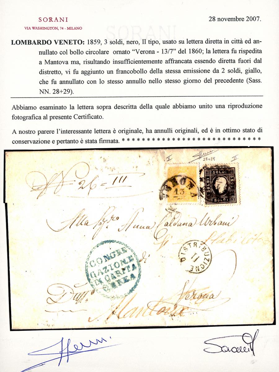 1860 - 3 soldi nero, II tipo (29), perfetto, apposto a Verona 13/7/1860 su lettera per città, che fu rispedita a Mantova, previa applicazione di un 2 soldi giallo, II tipo (28), perfetto, per integrare la nuova tariffa. Interessante e raro caso di integrazione di tariffa, probabilmente effettuato all'interno dello stesso ufficio postale. Cert. Sorani.