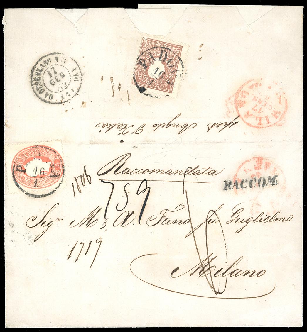 1862 - 5 soldi rosso e, al verso per il diritto di raccomandazione, 10 soldi bruno, II tipo (33,31), su fresca lettera raccomandata da Padova 16/1/1862 a Milano, tassata 60 cent. Molto bella.