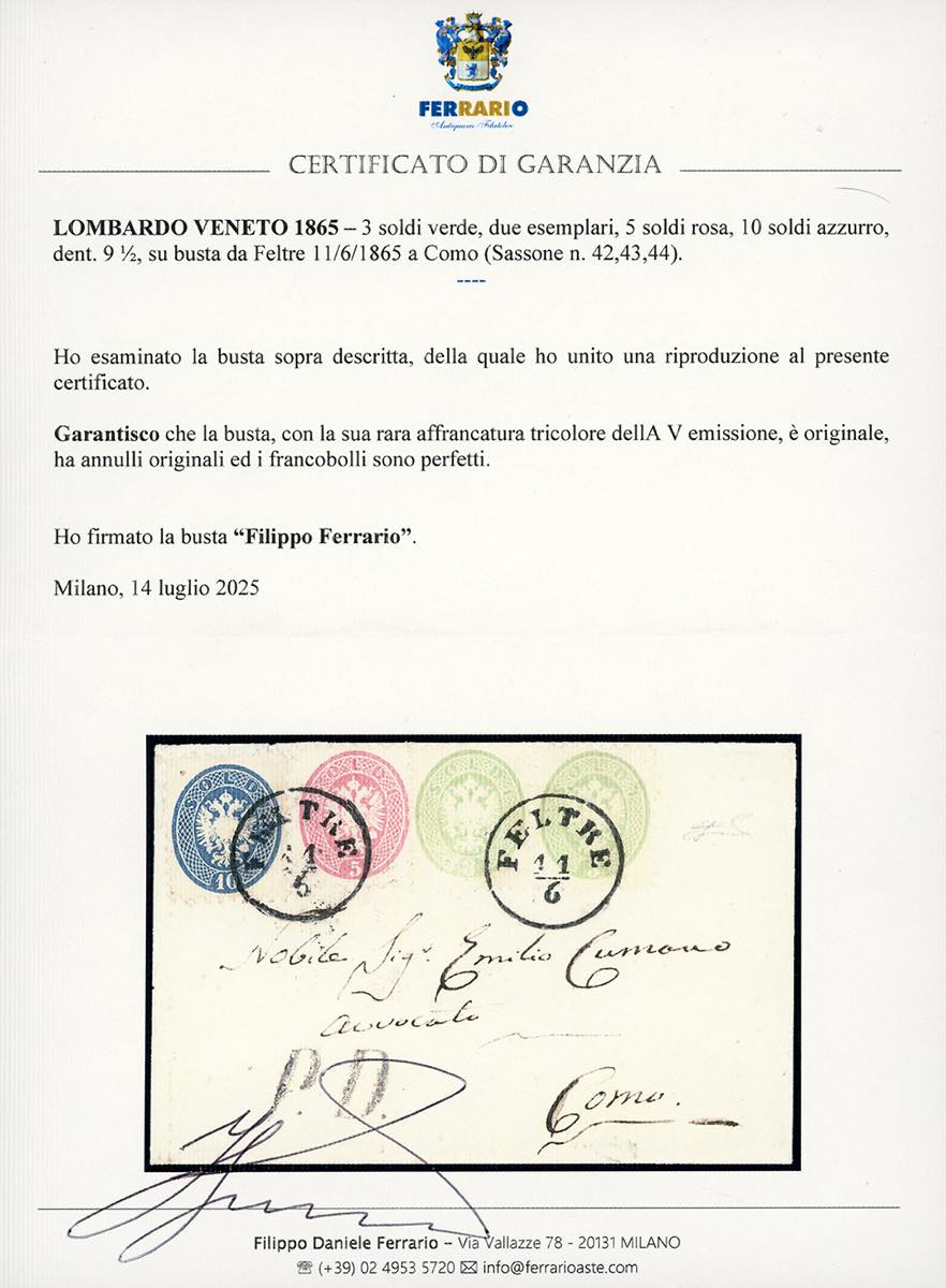 1865 - 3 soldi verde, due esemplari, 5 soldi rosa, 10 soldi azzurro, tutti dent. 9 1/2 (42,43,44), perfetti, su busta da Feltre 11/6/1865 a Como, bollo PD. Bella e rara affrancatura tricolore delle V emissione. Cert. Ferrario.