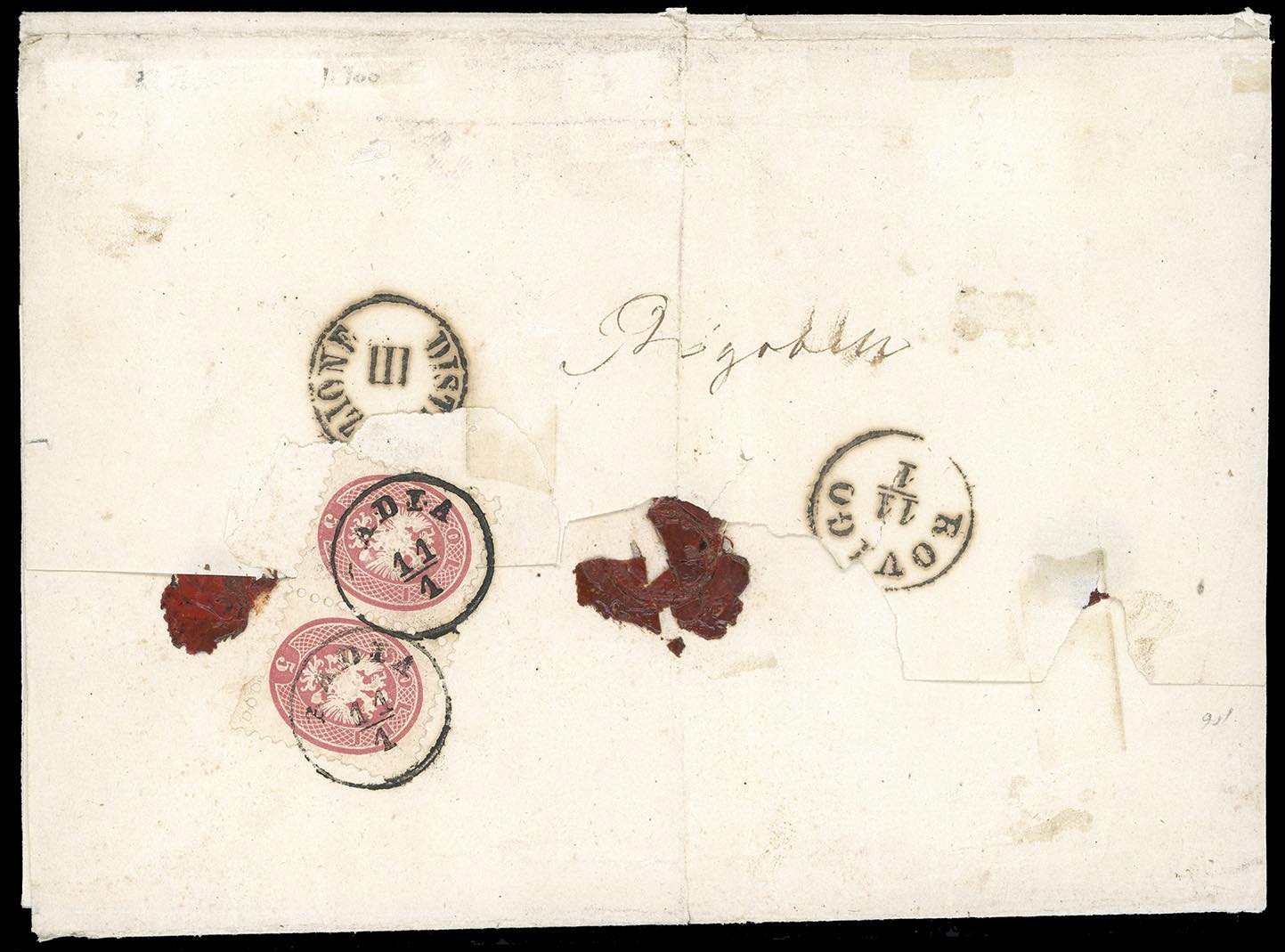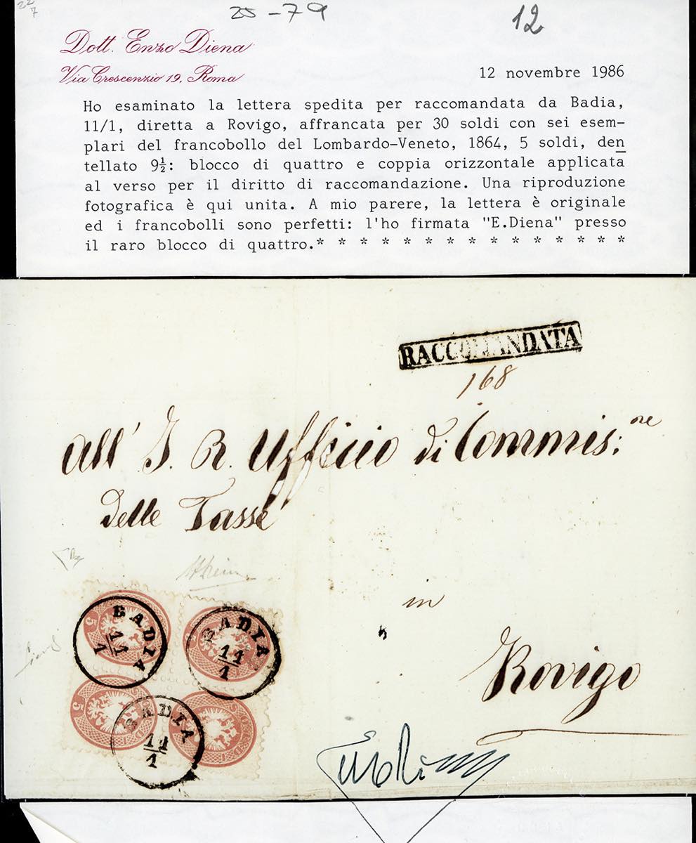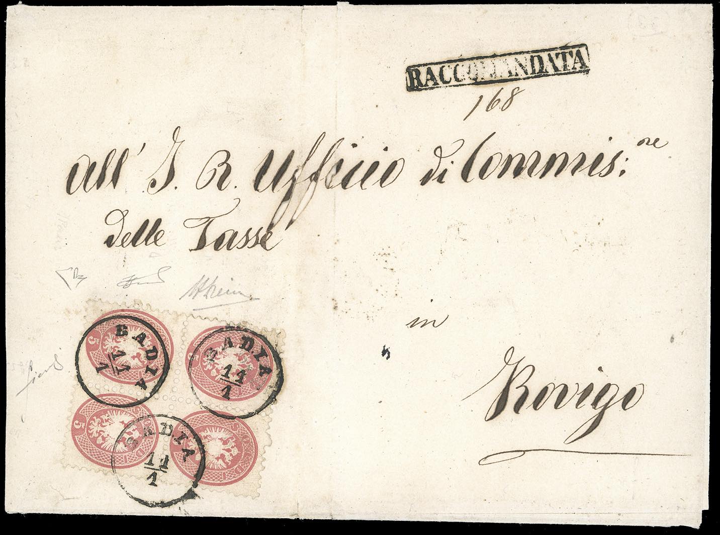 1864 - 5 soldi rosa, dent. 9 1/2 (43), blocco di quattro e, al verso coppia per il diritto di raccomandazione, perfetti, su lettera raccomandata da Badia 11/1 a Rovigo. Raro insieme di ottima qualità. A.Diena, Fiecchi, Ferrario, cert. E.Diena.