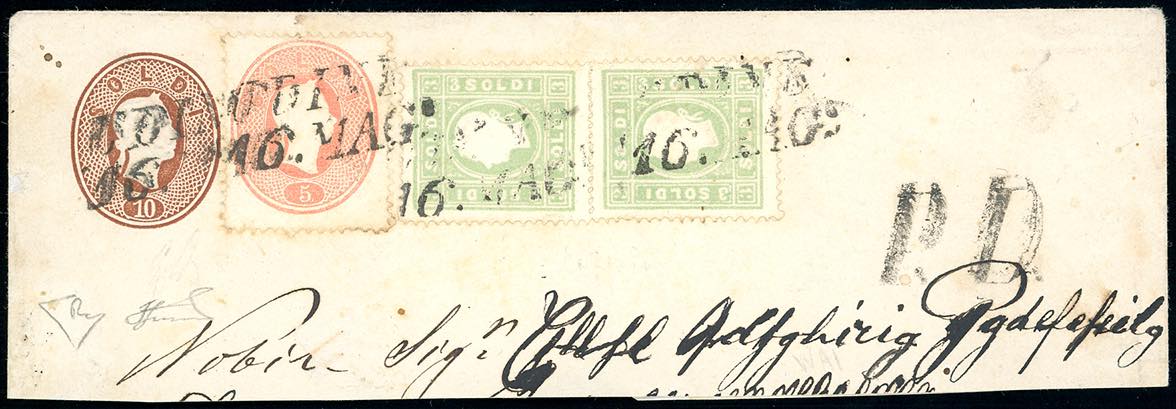 1861 - 10 soldi bruno rosso, testata di busta postale, formato piccolo (11), integrata con 5 soldi rossi chiaro e 3 soldi verde azzurrognolo, due esemplari (33a,35a), perfetti, da Udine 16/5/1863 a Bologna, bollo di arrivo al verso. Una delle due affrancature note così composte. Per specialista. Ferrario, cert. E.Diena.