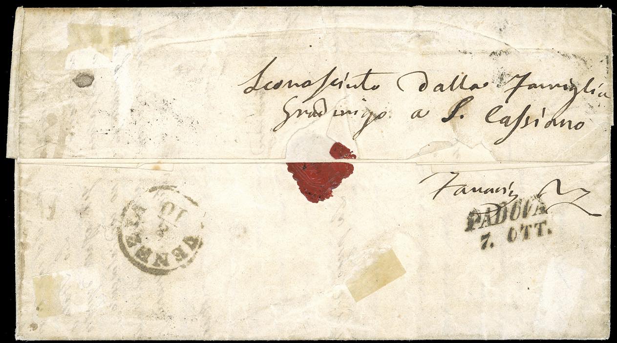 1855 - Lettera originariamente affrancata con un francobollo da 5 baj dello Stato Pontificio, ora asportato, da Bagnocavallo, via Ferrara, a Padova, dove venne rispedita il 7/10/1855 a Venezia, previa nuova affrancatura con 15 cent. marca da bollo tipografica (3), perfetta. Interessante rispedizione con una marca da bollo. Cert. Colla.