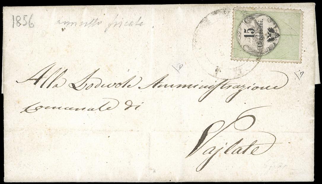 1856 - 15 cent., marca da bollo tipografica (3), perfetta, annullata con bollo amministrativo su lettera per Vailate, non tassata. ... Leggi tutto