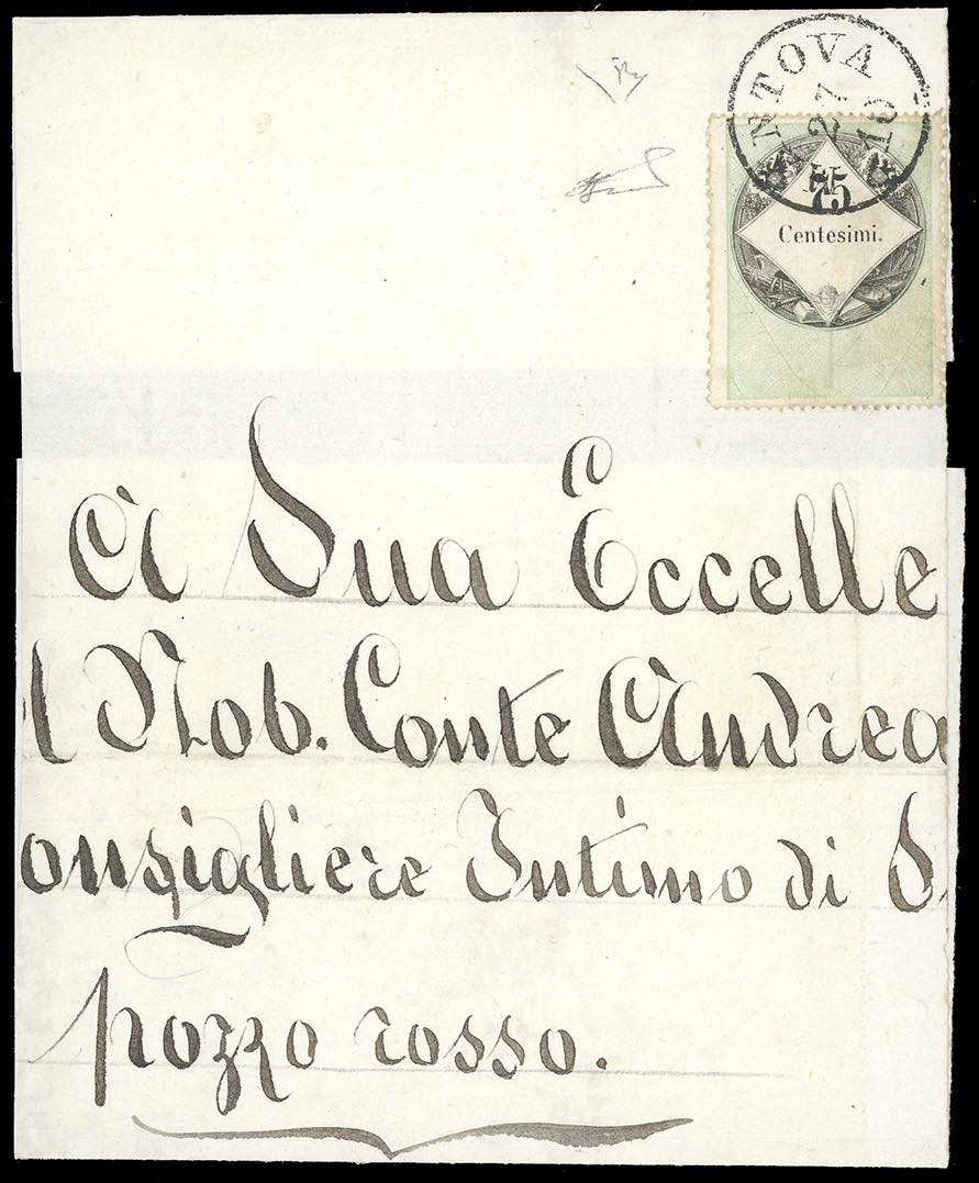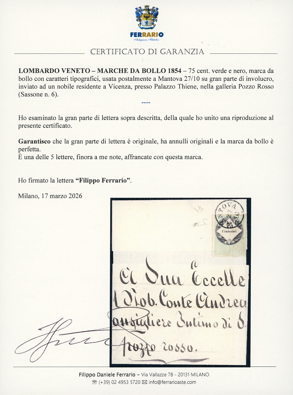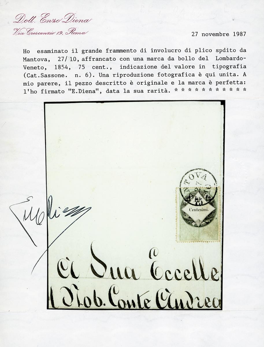 1854 - 75 cent. verde e nero, marca da bollo con caratteri tipografici (6), perfetta, usata postalmente a Mantova 27/10 su gran parte di involucro, inviato ad un nobile residente a Vicenza, presso Palazzo Thiene, nella galleria Pozzo Rosso. Si tratta di una delle 5 lettere note affrancate con questa marca. Rarità del settore. Cert. Ferrario ed Enzo Diena 1987. (Sassone € 40.000 come frammento e 100.000 € come busta).