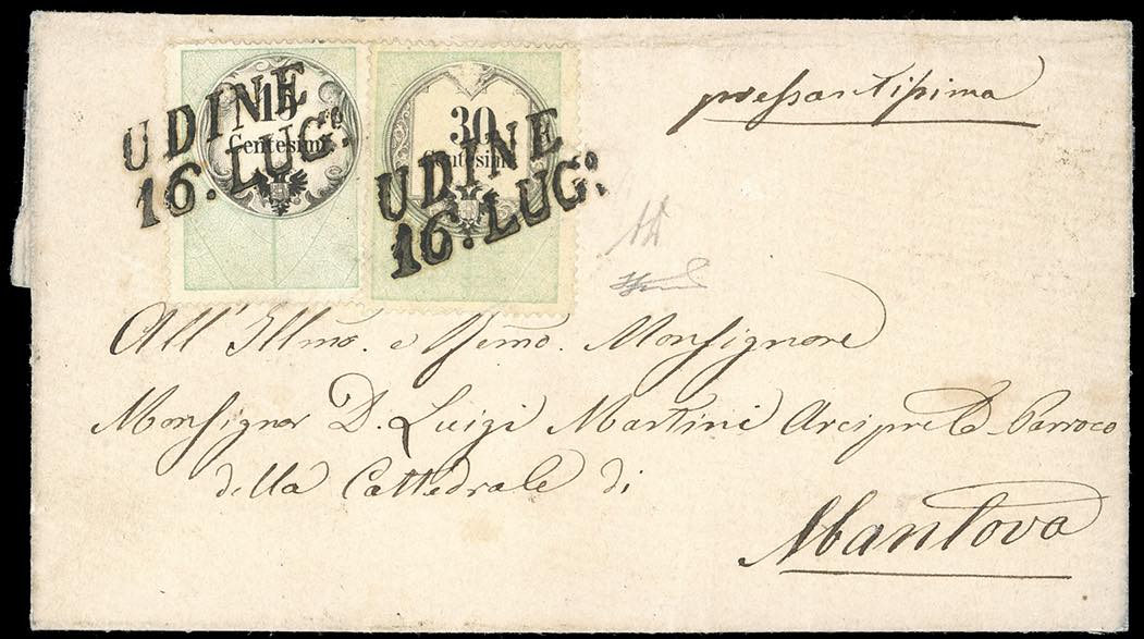 1854 - 15 cent. e 30 cent., marche da bollo calcografiche (7,8), perfette, su fresca lettera da Udine 16/7 a Mantova. Molto bella. A.Diena, Ferrario.