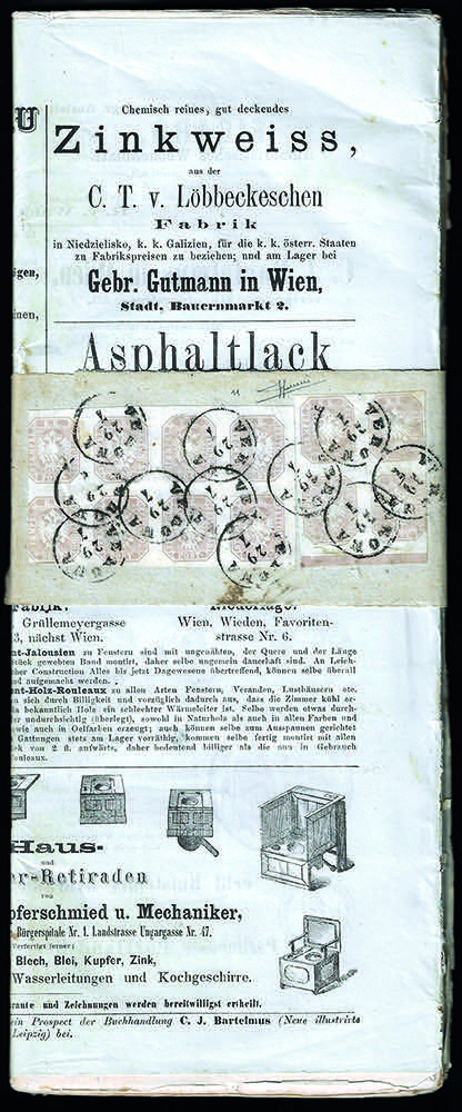 1865 - 1,05 soldi bruno grigiastro (11), blocchi di otto e di quattro, questo con ampio margine di foglio in basso e fascia di colore, margine sinistro del blocco di otto leggermente sfiorato, su fascetta, completa di giornale, da Verona 29/7/1865 per città. ECCEZIONALE AFFRANCATURA MULTIPLA DI GRANDE FRESCHEZZA E RARITA'. Cert. Sorani.