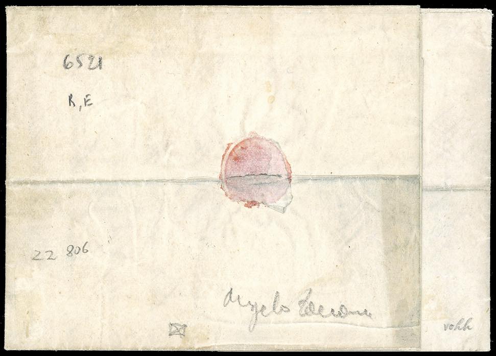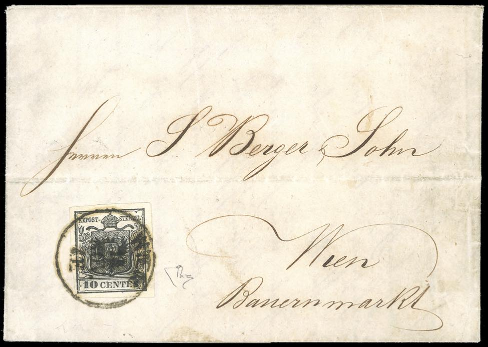1851 - 10 cent. nero, carta a mano, decalco nitido e completo al verso (2f), perfetto, su lettera da Vienna 11/11/1851 per città. Il francobollo è stato sollevato dalla lettera per verificare il decalco e ricollocato nella posizione originaria mediante linguella. Interessante uso dei francobolli in centesimi in Austria, impreziosito dalla bella varietà. Splendida qualità. Cert. E.Diena.