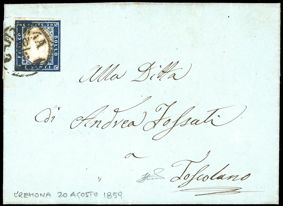 ALTA VALLE DEL TOSCOLANO 1859 - 20 cent. azzurro scuro (15B), due margini a filo, su lettera da Cremona 20/8/1859 a Toscolano, bollo di arrivo al verso. Rara incoming mail in periodo di occupazione austriaca. Molto fresca, Cert. Ferrario.