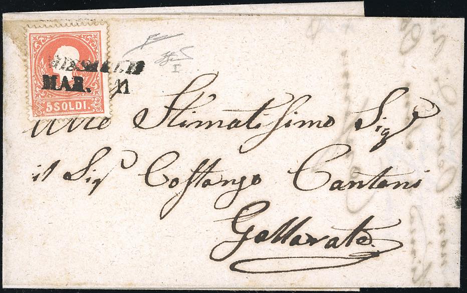 MISSAGLIA, punti 13 - 5 soldi (25), perfetto, su lettera dell'11/3/1859 per Gallarate. Rara. Ferrario, cert. Diena.
