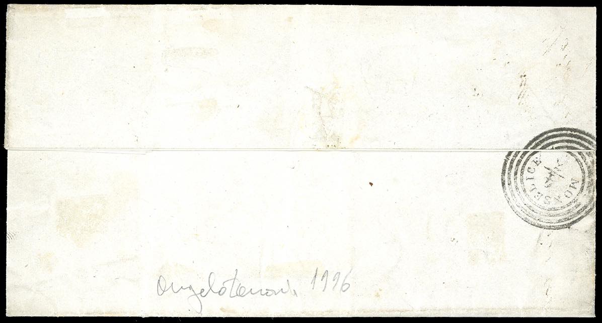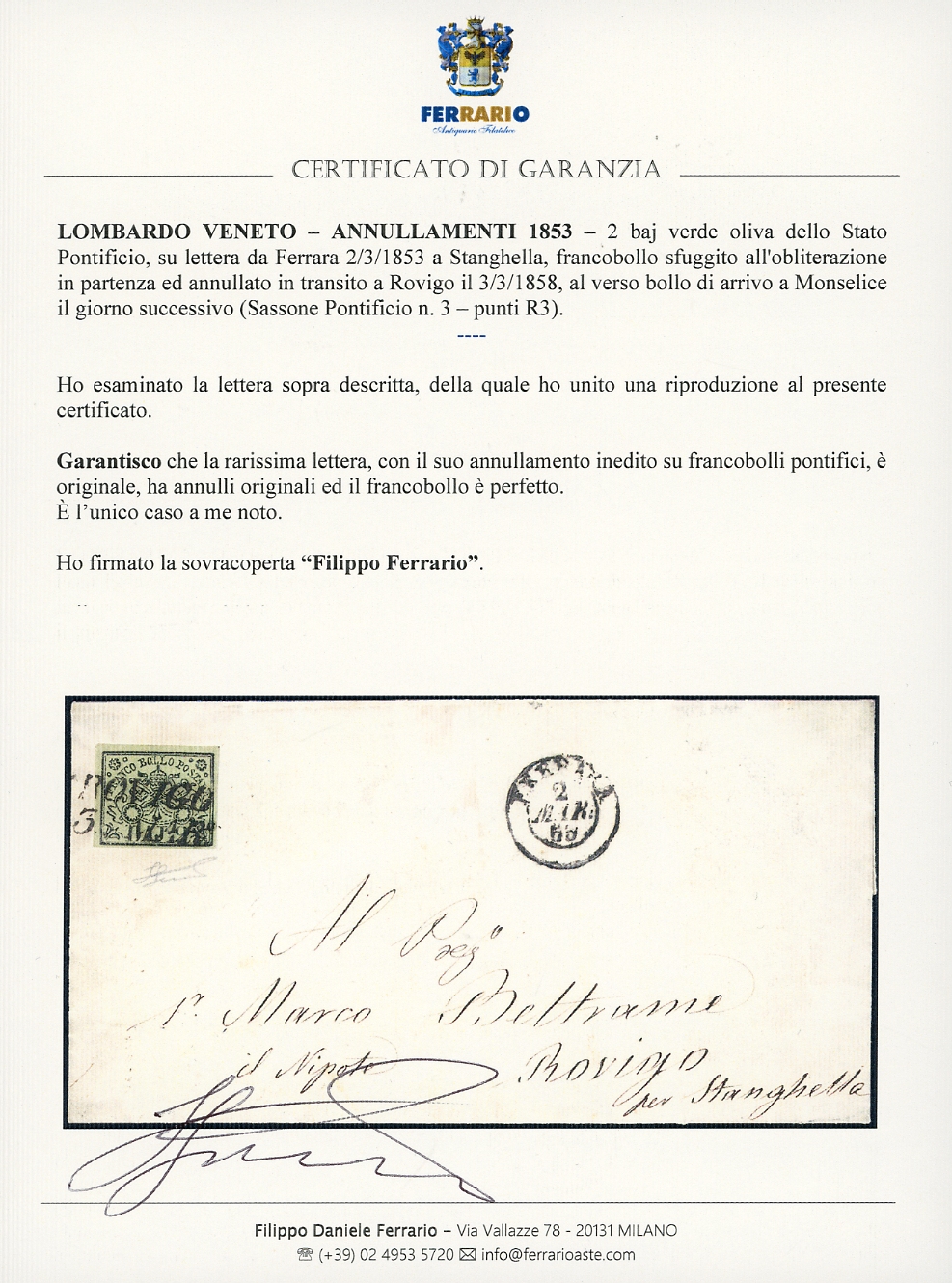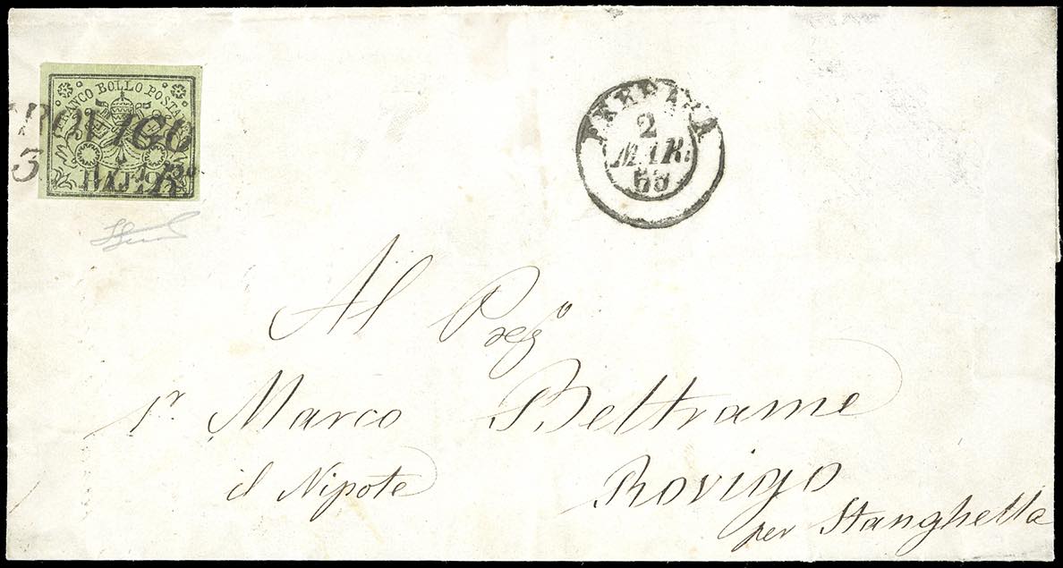 ROVIGO, SI su Pontificio non catalogato - 2 baj verde oliva (Pontificio 3), perfetto, su lettera da Ferrara 2/3/1853 a Stanghella, francobollo sfuggito all'obliterazione in partenza ed annullato in transito a Rovigo il 3/3/1858, al verso bollo di arrivo a Monselice il giorno successivo. Annullamento inedito su francobolli pontifici, quotato punti R3 su francobolli di Modena e Toscana. Angelo Zanaria per esteso e cert. Ferrario.